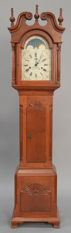 Custom cherry grandmother’s clock with shell carved case, moon phase dial, and brass works. ht. 55in., wd. 12in.