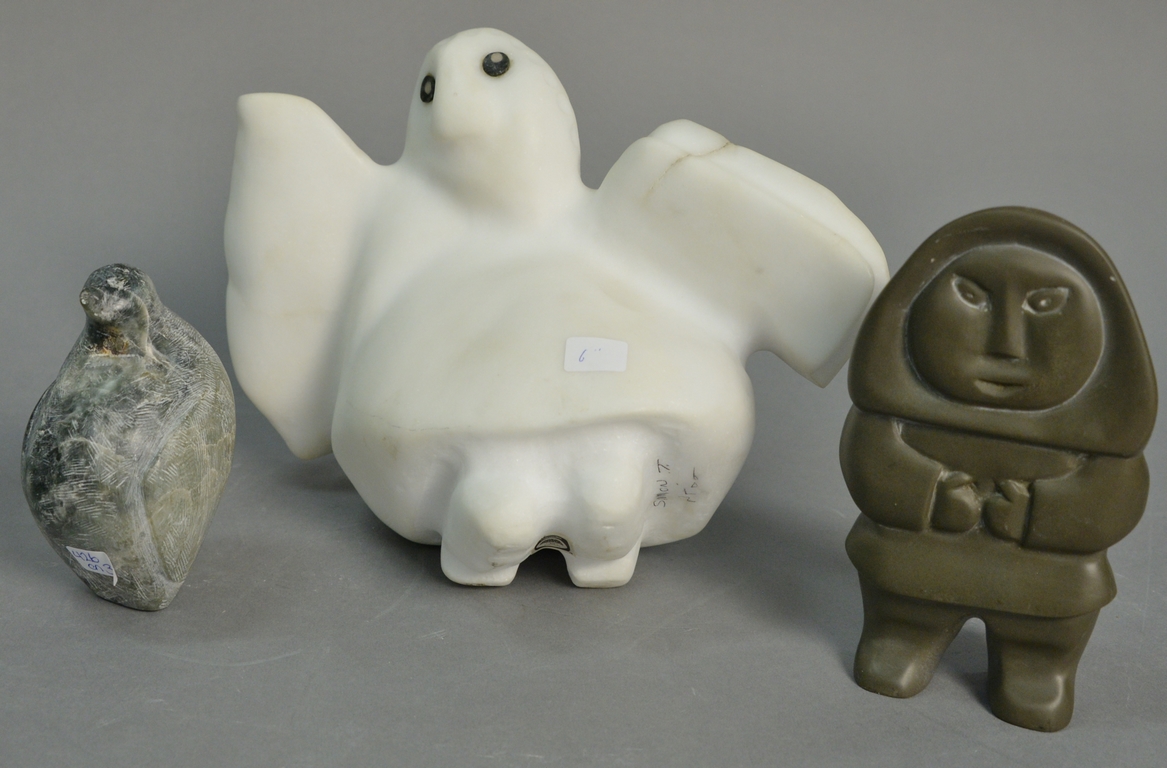 Three Inuit Eskimo carvings including Annie Niviaxie 1930-1989 Kuujjuaraapik serpentine Mother and Child ht. 4in., Eli Tikeayak 1933-1995 Rankin Inlet serpentine Bird ht. 4in., and Simon Takkiruq Gjoa Haven Canada marble White Bird Spirit ht. 6in..