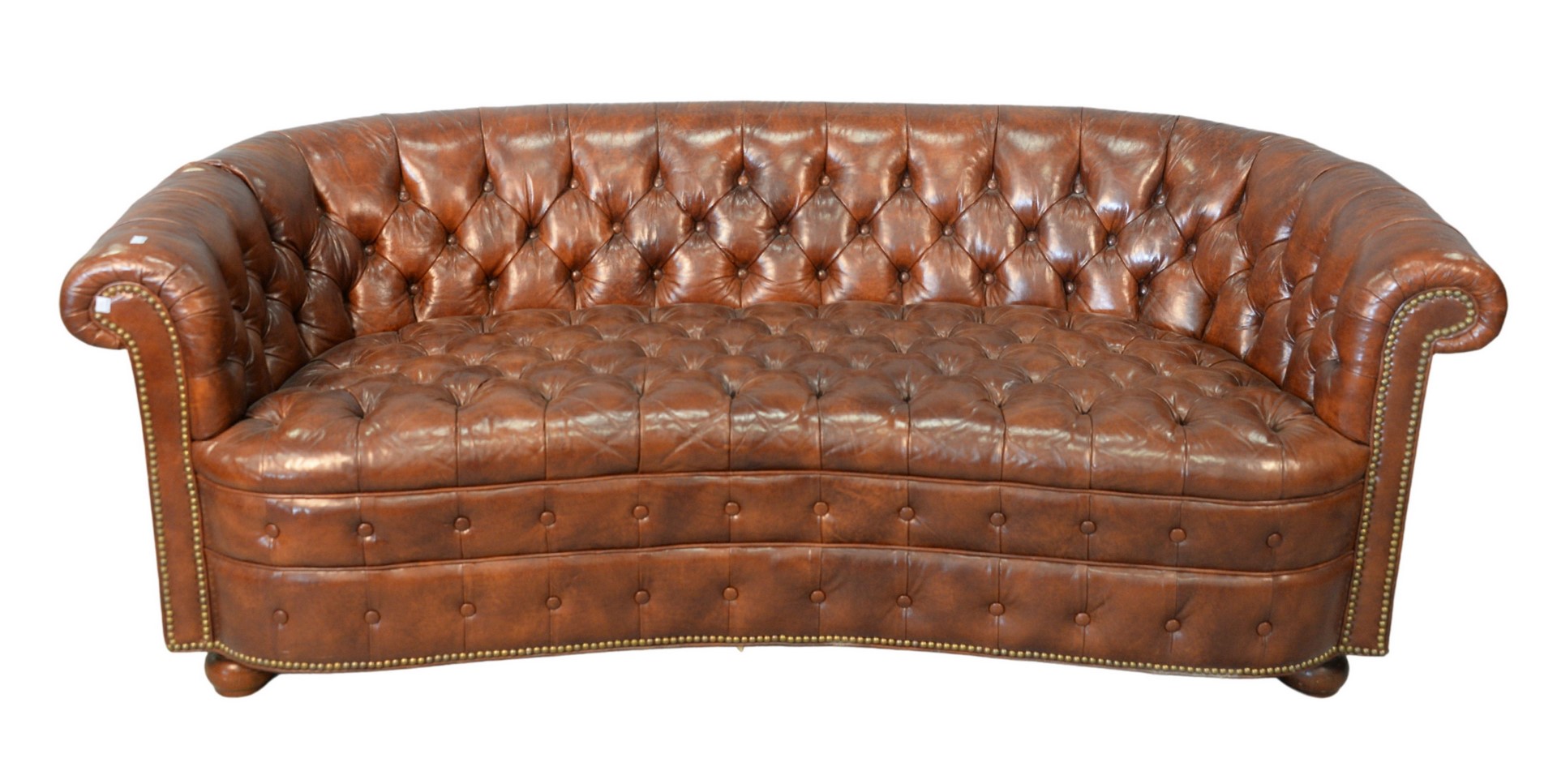 Lot 426: Brown Leather Tufted Sofa height 28 inches, length 73 inches