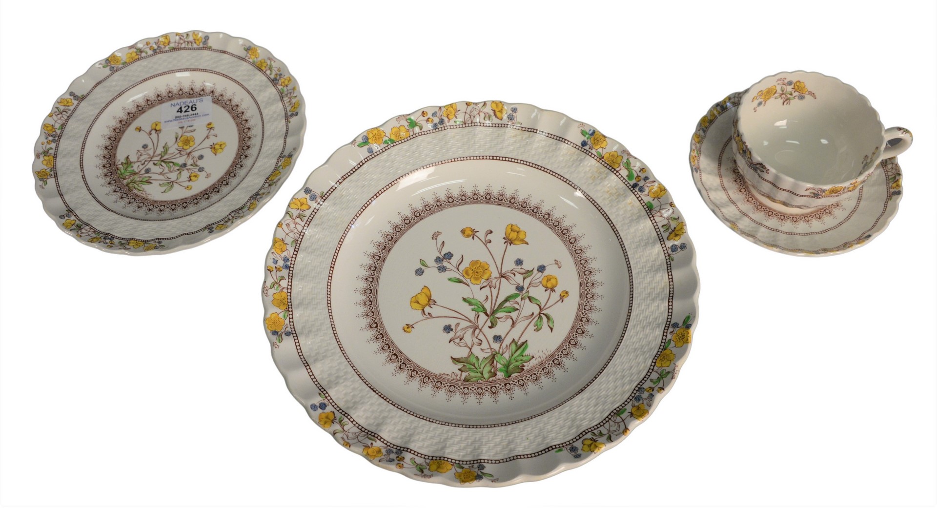 Lot 426: Copeland Spode “Buttercup” Dinner Service for 16, to include 16 dinner plates; 8 salad plates; 20 dessert plates; 20 saucers; 16 teacups; 3 serving plates; 1 gravy dish with underplate; 1 teapot; 1 covered sugar; along with 1 creamer, 102 pieces total, diameter of dinner plate 10 1/2 inches.