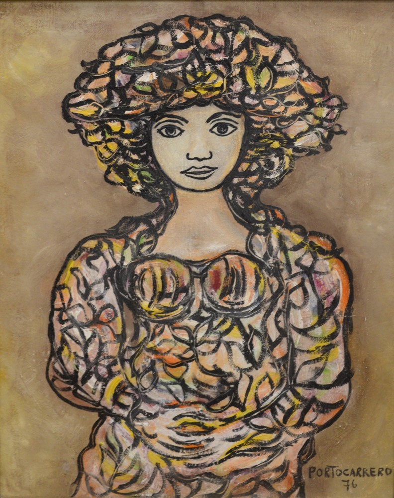 Page load linkLot 426: In The Manner of Rene Portocarrero (Cuban, 1912 – 1986), Female Figure, oil on canvas, marked and dated “76” lower right, marked, da…