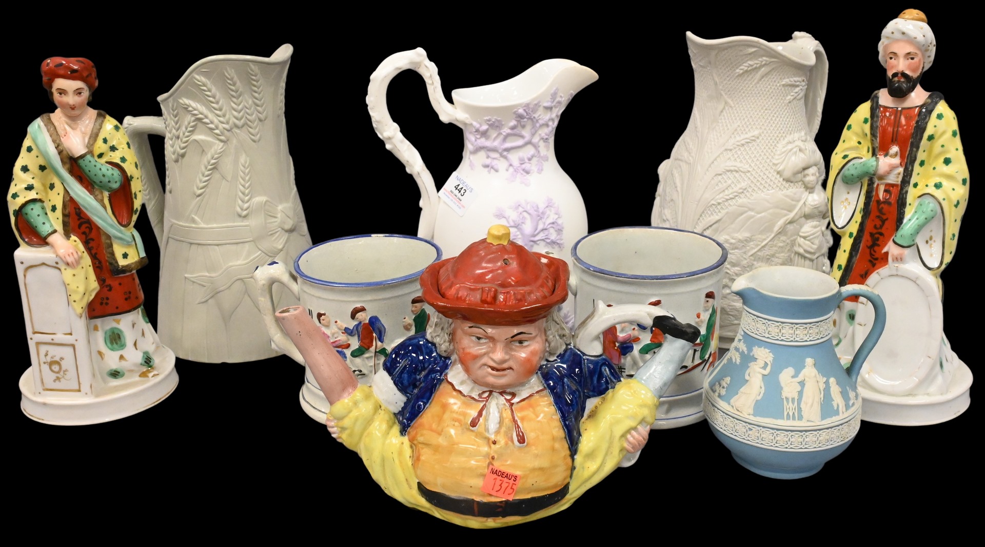 Comprising a pair of export porcelain figures in colorful robes, each surmounted by gilt-bronze branches issuing enameled flowers and foliate candle sockets, raised on conforming giltwood hexagonal bases, together with a pair of porcelain doves, with white feathered bodies and red crests, perched upon brightly enameled drum-form bases decorated in famille rose enamels with scrolling designs and gilt accents.