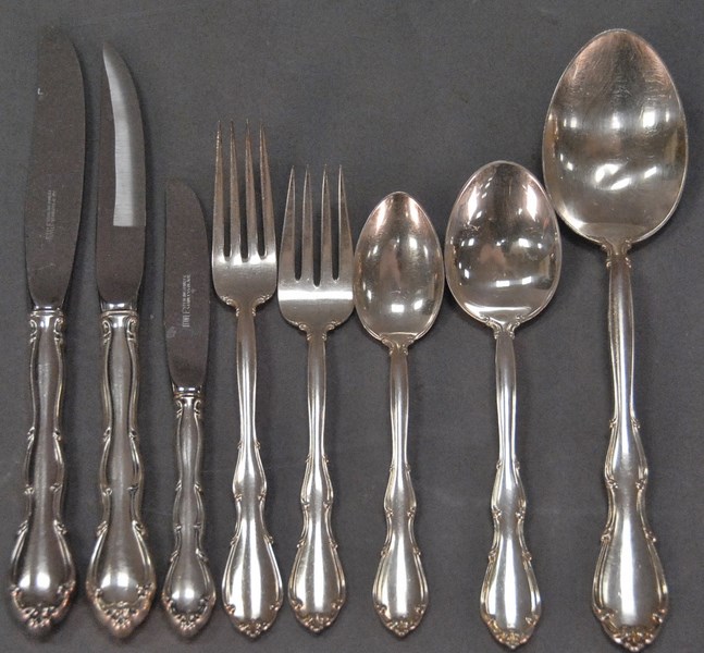 Lot 464: Towle sterling Fontana flatware set to include 12 luncheon forks, 12 soup spoons, 13 dinner forks, 15 teaspoons, 10 butter knives, 8 steak knives, 13 dinner knives, and 4 serving pieces, 87 total pieces, 72 t oz. plus 33 handles.