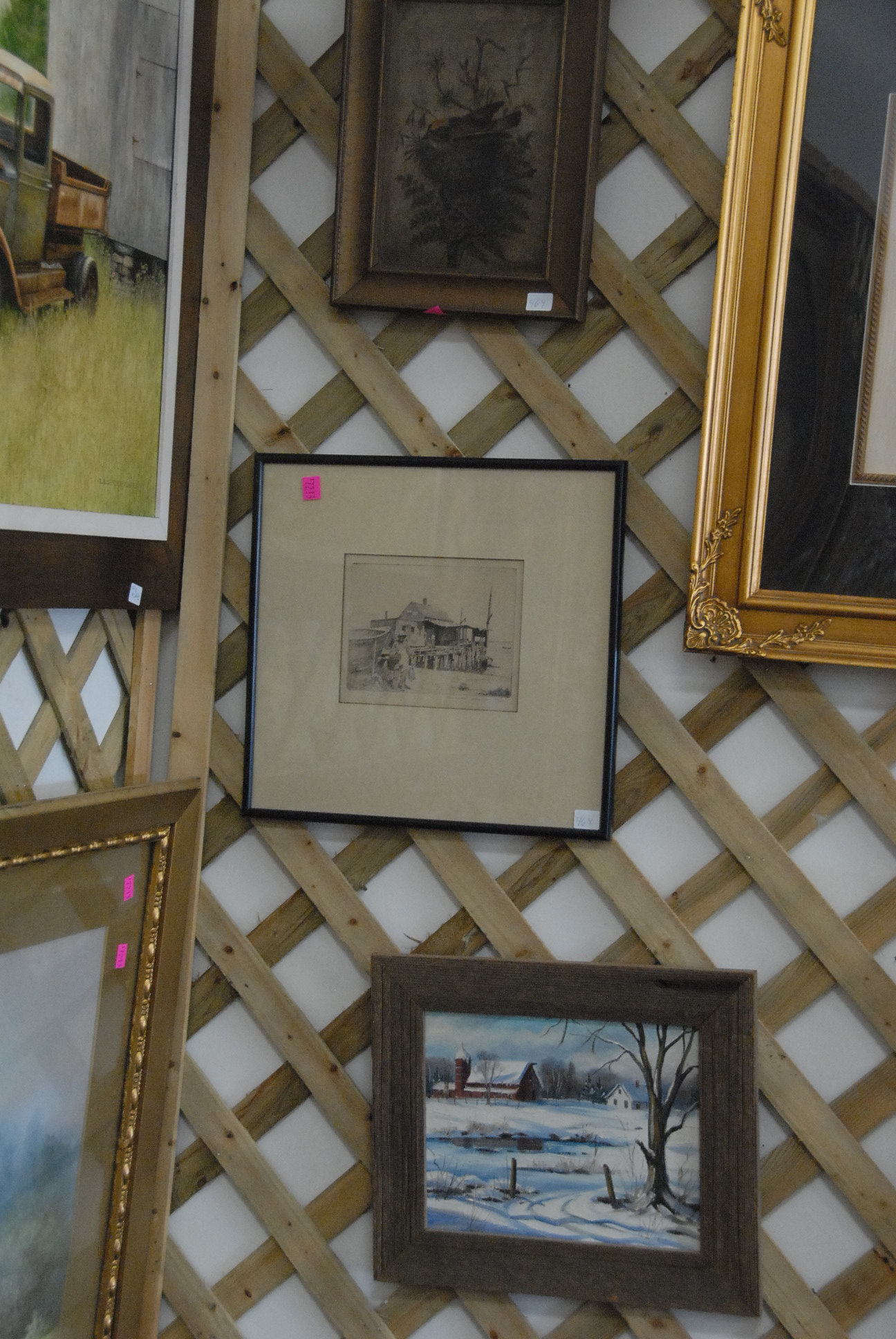 Three piece lot to include oil on board signed lower right indistinctly, an etching The Old Wharf signed lower right, and oil on board winter landscape signed lower left Amaral.