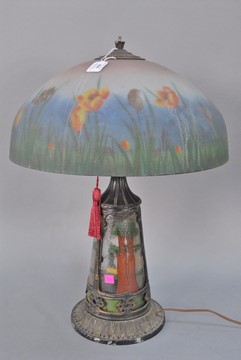 Lot 464: Reversed painted table lamp with light up base. dia. of shade 16 in.