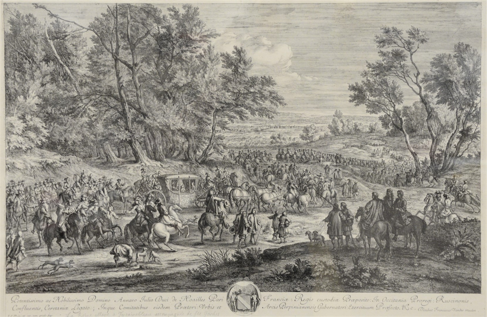 Lot 464: After Adam Frans van der Meulen (Flemish, 1632 – 1690), “La reine allant a Fontainebleau accompagnee de ses gardes”, copper plate engraving on paper, titled in pencil along the lower edge, inscribed in plate throughout the lower margin, image size 18 1/2″ x 30″.
