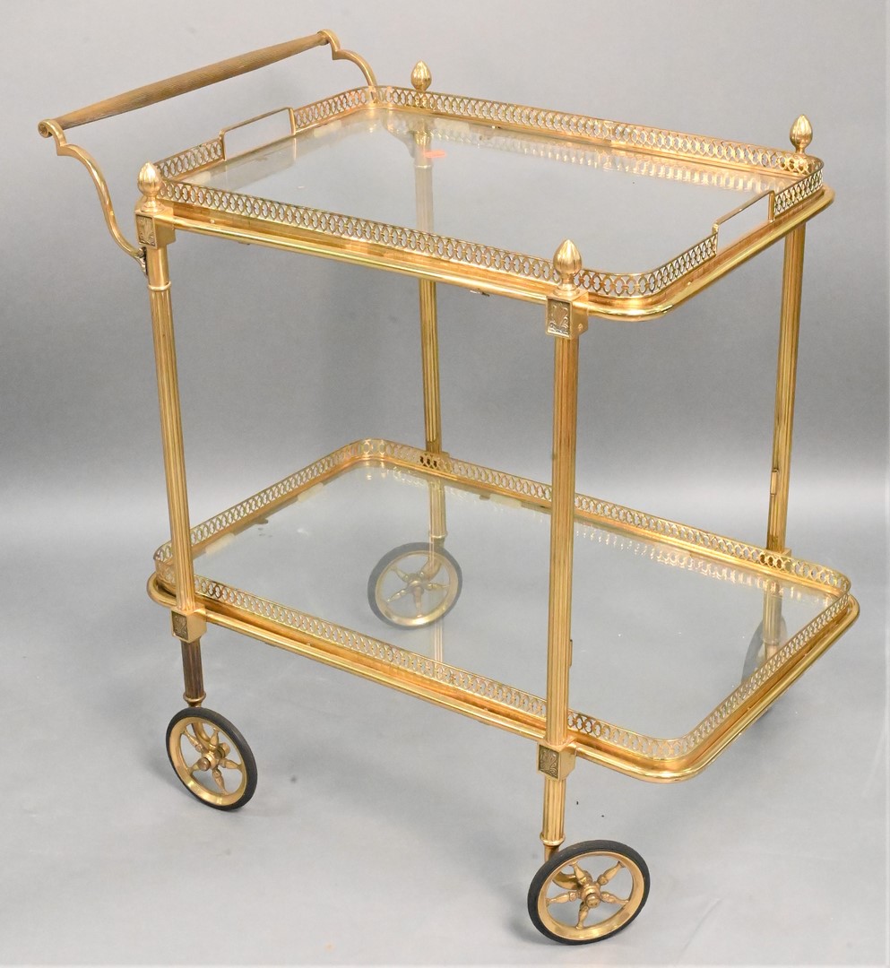 Brass and Glass Tea Cart, height 28 1/2 inches, top 18″ x 26″.