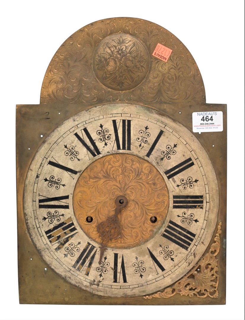 19th Century Clock Face, having brass works and metal frame, height 14 1/2 inches, depth 10 1/2 inches. Provenance: Estate of Peter Tillou, Litchfield, Connecticut.