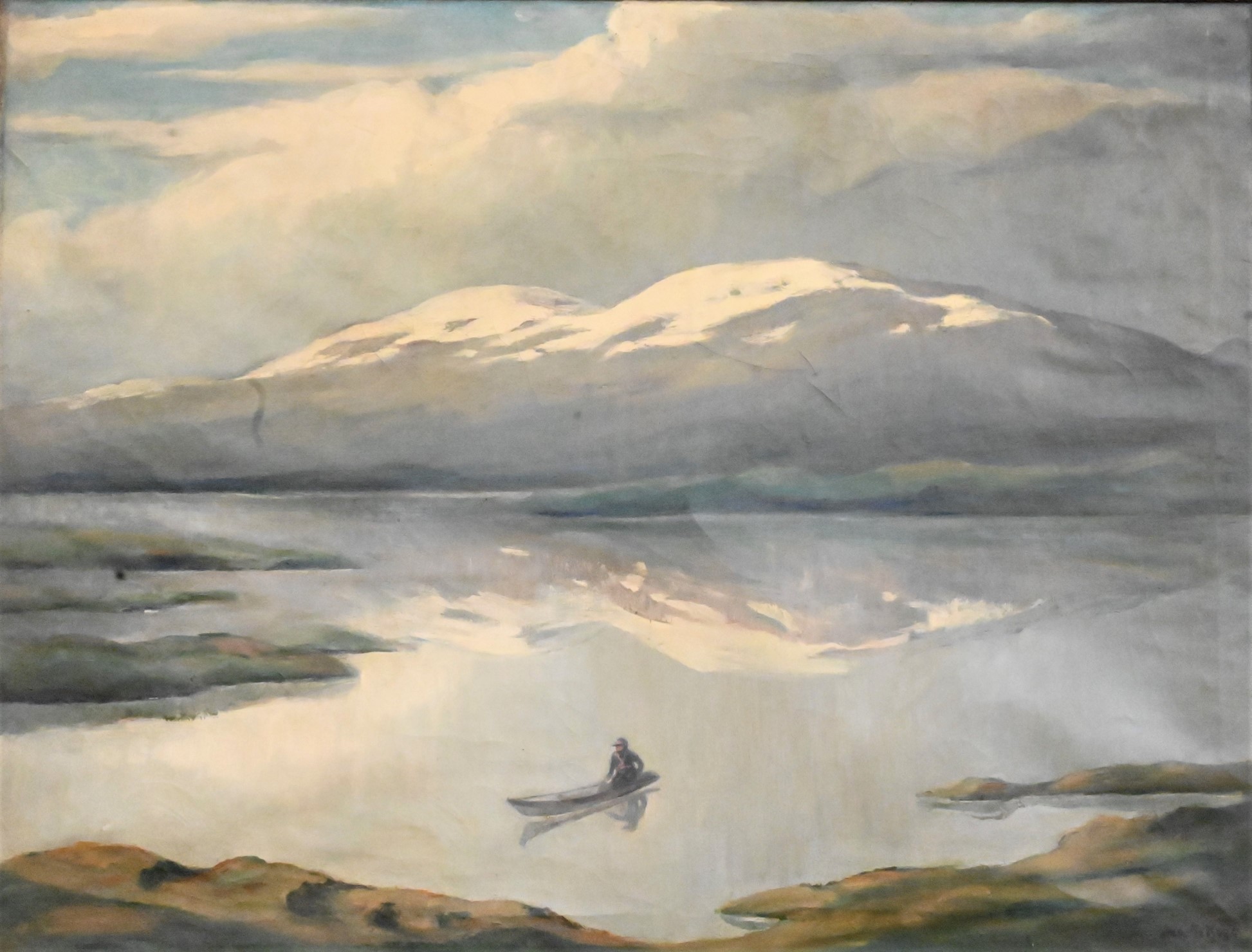 Svante Kede (Swedish, 1877 – 1955), mountain and lake with fishermen, oil on canvas, signed lower right “Svante Kede”, Swedish title and artist name written on back, 23″ x 30″.