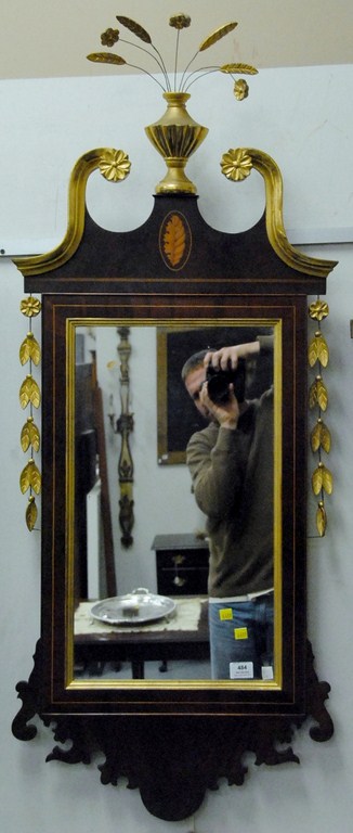 Custom mahogany Federal style mirror with gilt plume finial and arched top over inlaid mahogany frame. Provenance: Estate of Judy McDonough Gengras of Stoner Drive, West Hartford, Connecticut. wd. 21in.