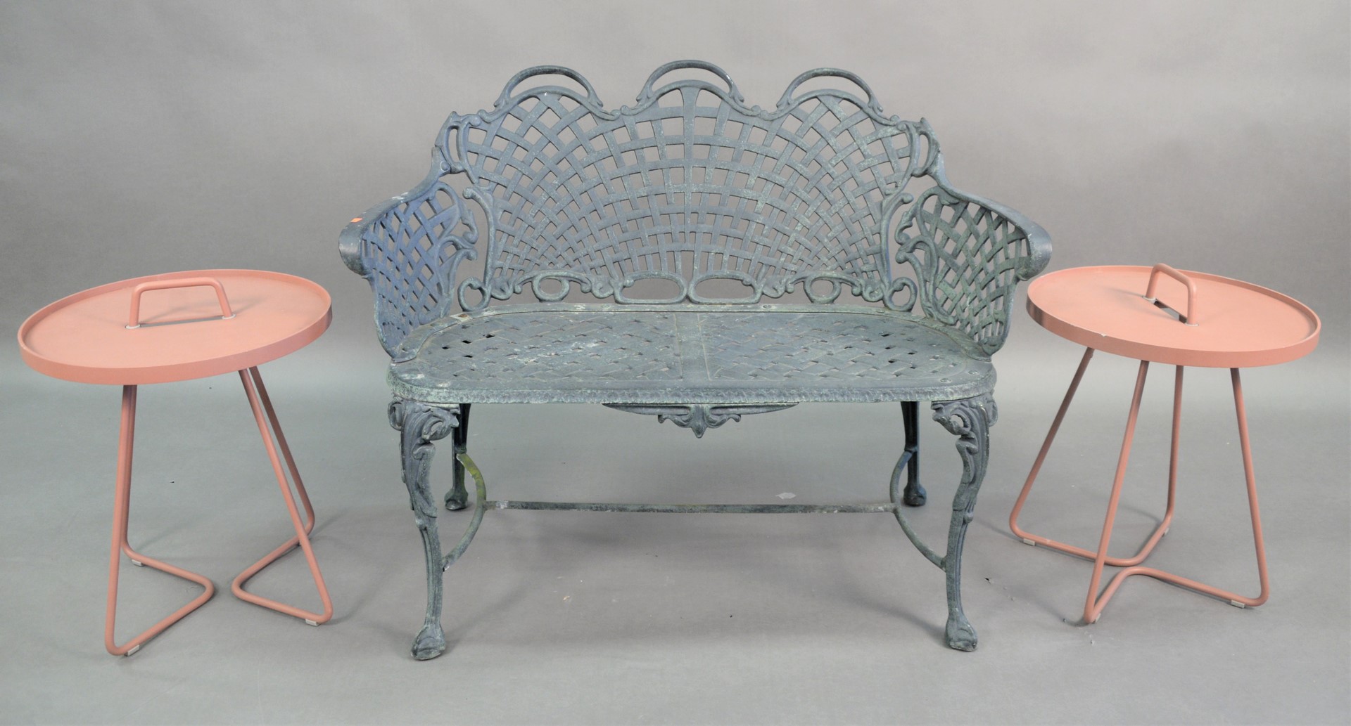 Four Piece Outdoor Lot, to include bench along with a pair of modern side tables and a glass table, bench height 39 1/2 inches. Provenance: David and Cynthia Kim, 22 Stoney Wylde Lane, Greenwich, Connecticut. View home by visiting: https://www.zillow.com/homedetails/22-Stoney-Wylde-Ln-Greenwich-CT-06830/177238281_zpid/