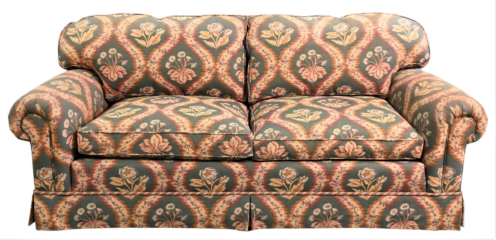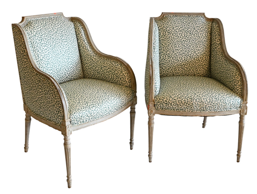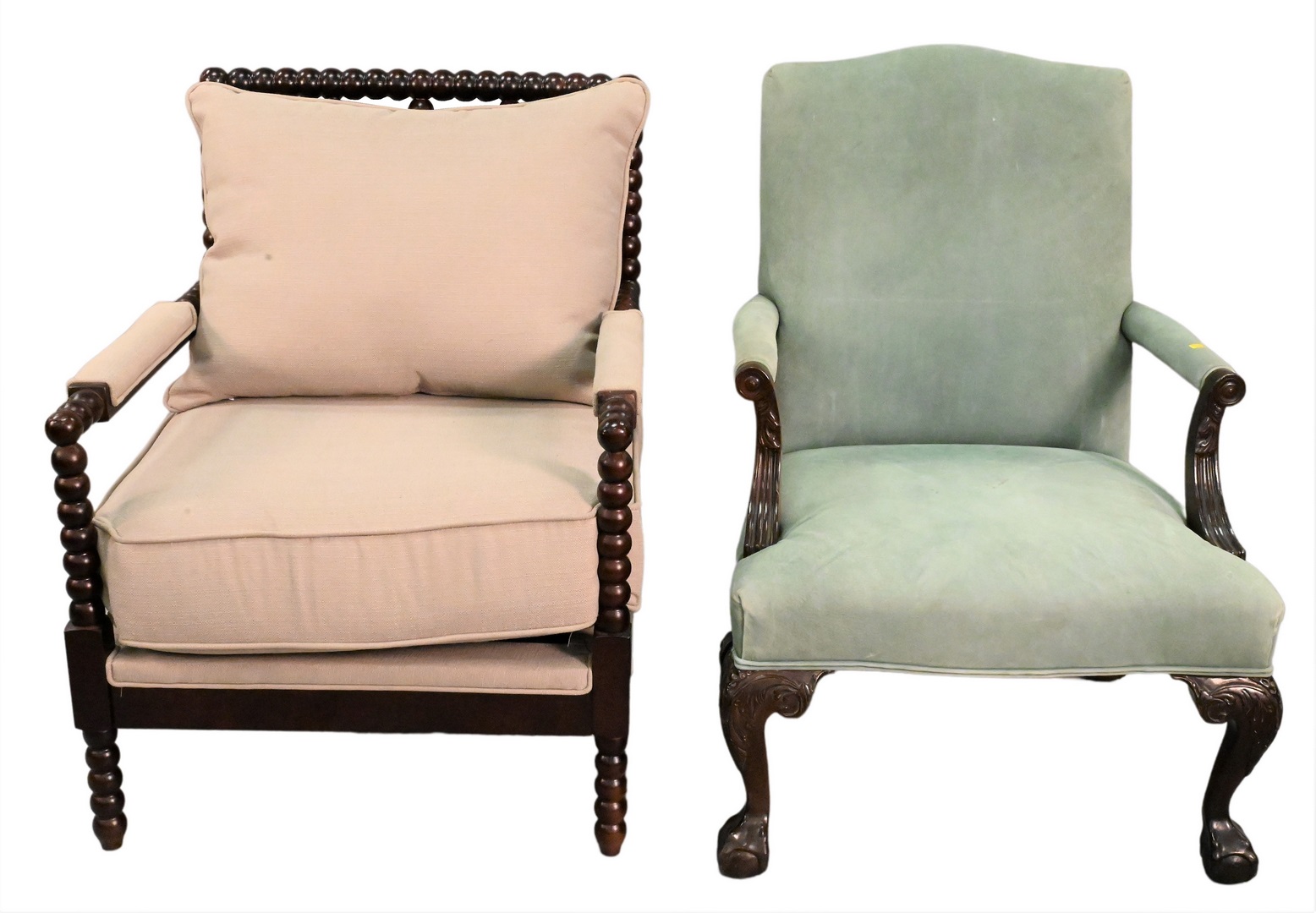 Two Upholstered Open Armchairs, to include one having spool frame, height 37 inches, width 29 inches; along with one having carved frame ending in ball and claw feet, height 39 inches, width 28 inches.