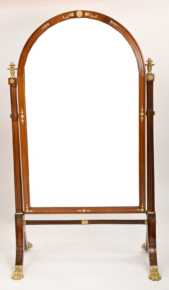 French Empire Style Mahogany Cheval Mirror, having pediment and bronze two-sided female faces, all set on square posts ending in gold painted claw feet, height 81 inches, width 45 inches.