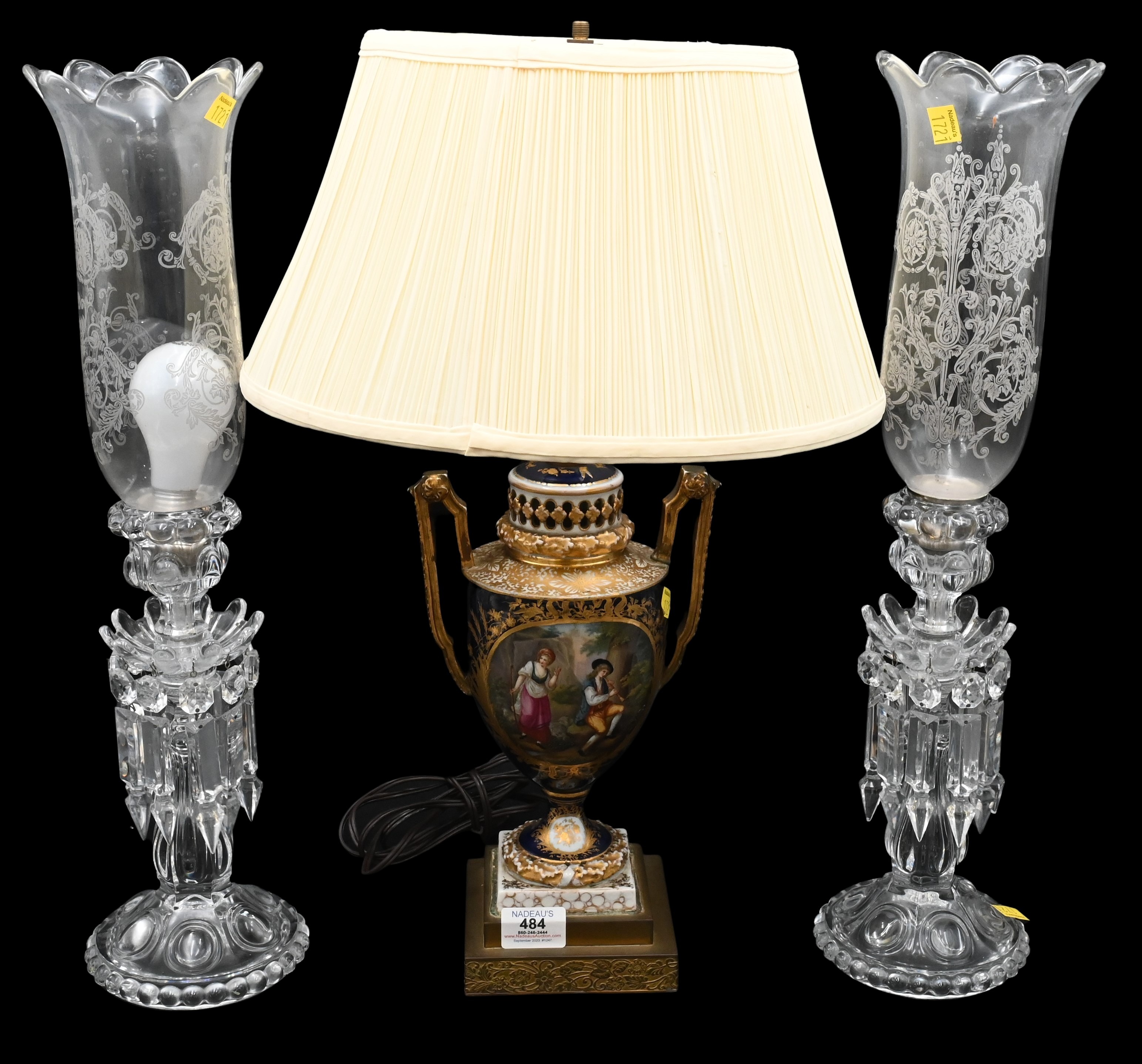 Three Table Lamps, to include a Sevres style porcelain double handled urn mounted as a lamp (as is), along with a pair of glass Baccarat style lusters, tallest height 21 1/2 inches.