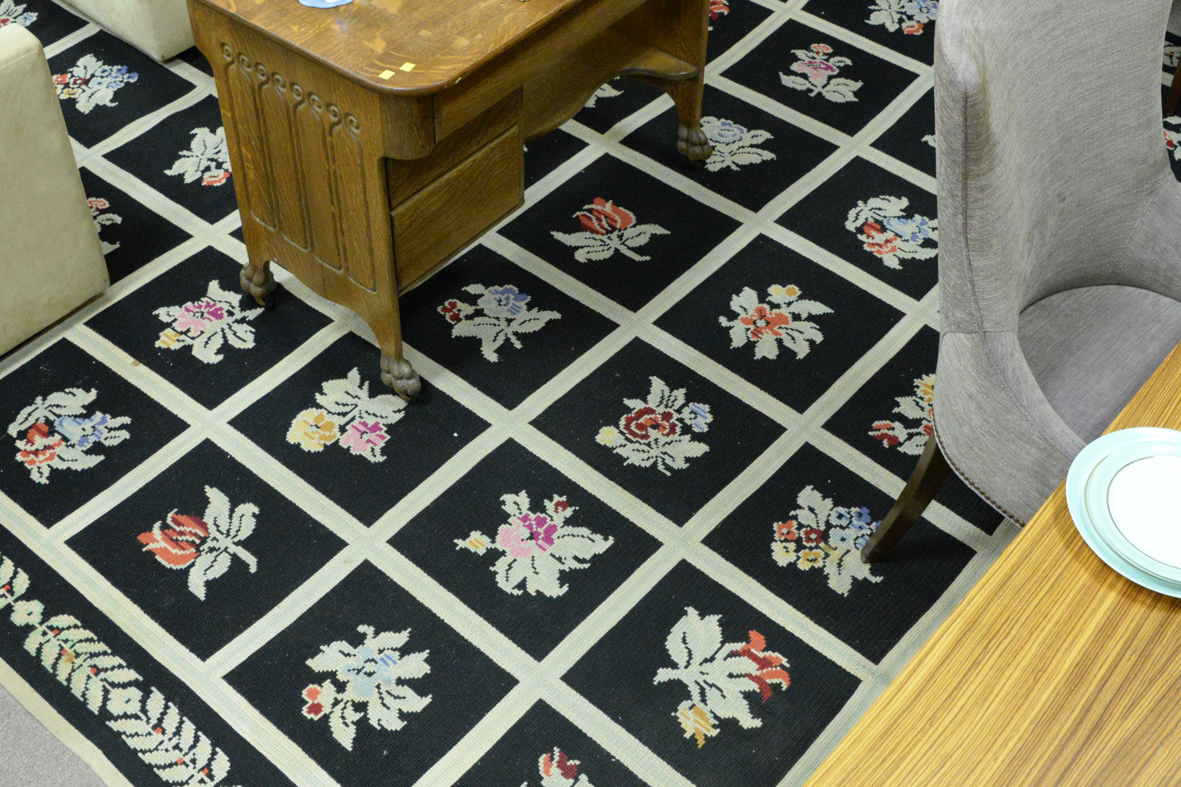 Needlework Carpet, second half 20th century, black ground with polychrome flower squares, probably Portuguese 18′ x 10′