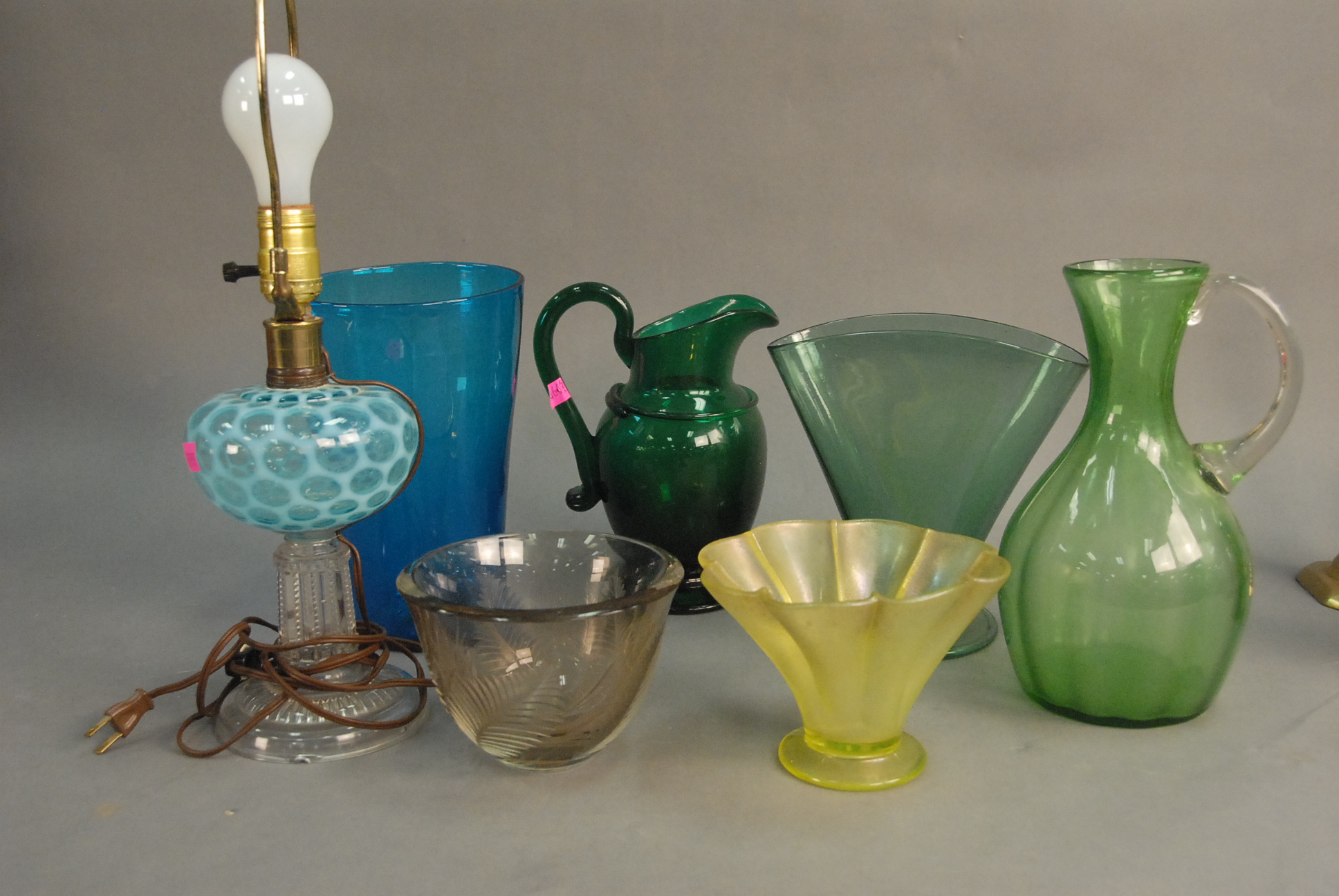 Seven art glass pieces, six color glass stems to include hand-blown green glass pitcher and vase, large hand blown blue vase, oil lamp, vase, and pitcher along with an etched glass vase.
