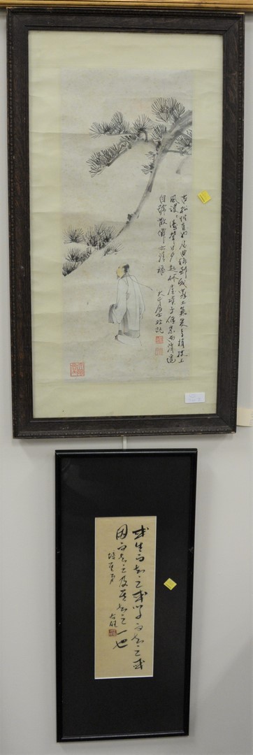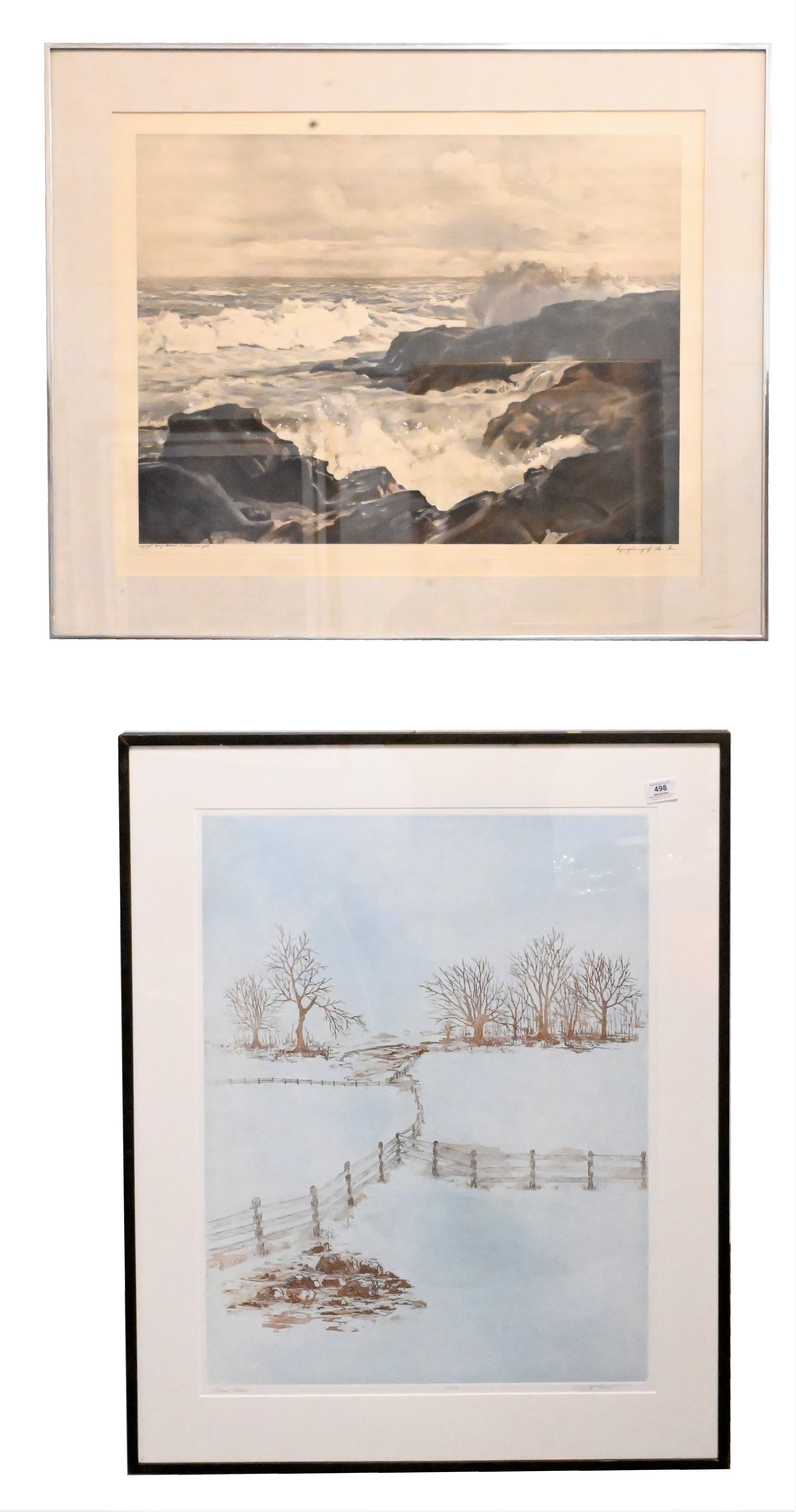 Four Piece Art Group, to include Vicente Denigris (Argentinian, 1938 – 1984), etching, ‘Snow Dream’, frame size 35″ x 27 1/2″, image size 34″ x 26″; Mel Hunter (American, 1927 – 2004), lithograph on paper, ‘At the Bend’, paper size 15″ x 25 1/2″; Henry Gottlieb, print, ‘Sympathy of the Sea’, image size 20 1/2″ x 26 1/2″, copyright Henry Gottlieb, publisher, New York; along with Arthur Dove (1880 – 1946), poster, ‘A Retrospective Exhibition, 1975’, damaged, torn, dirty, 37 1/2″ x 23 1/2″.