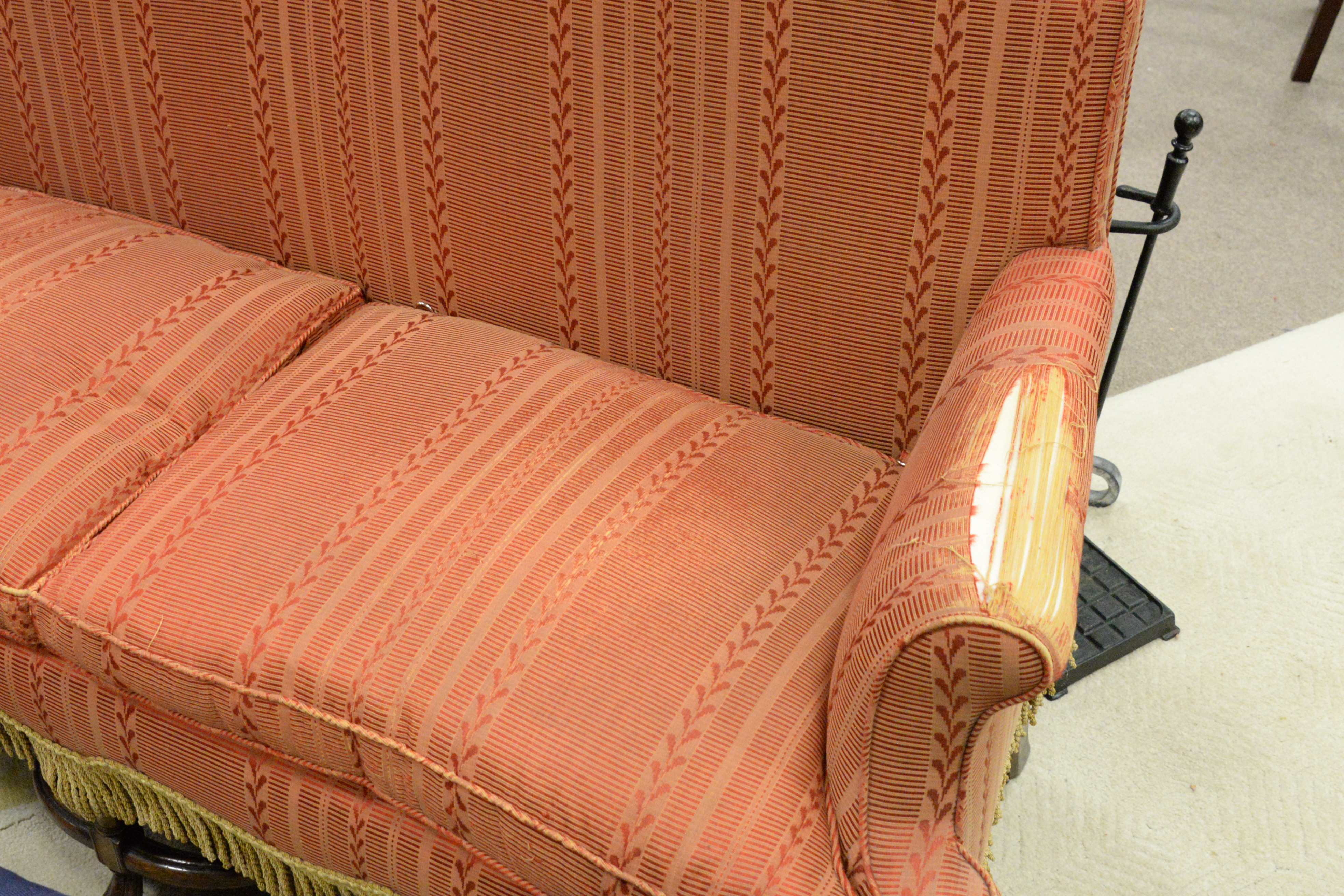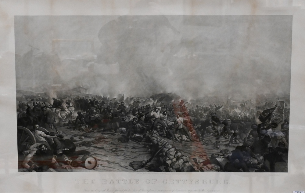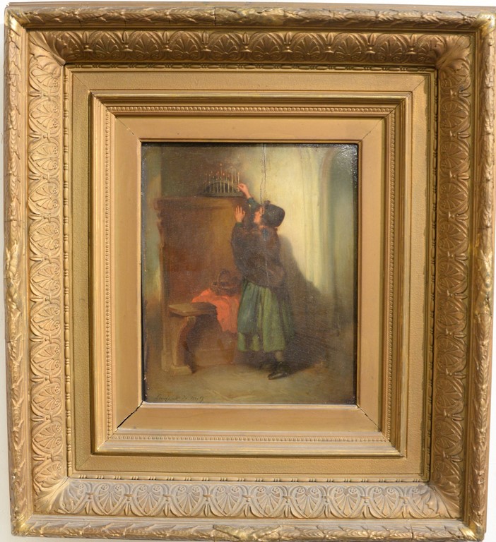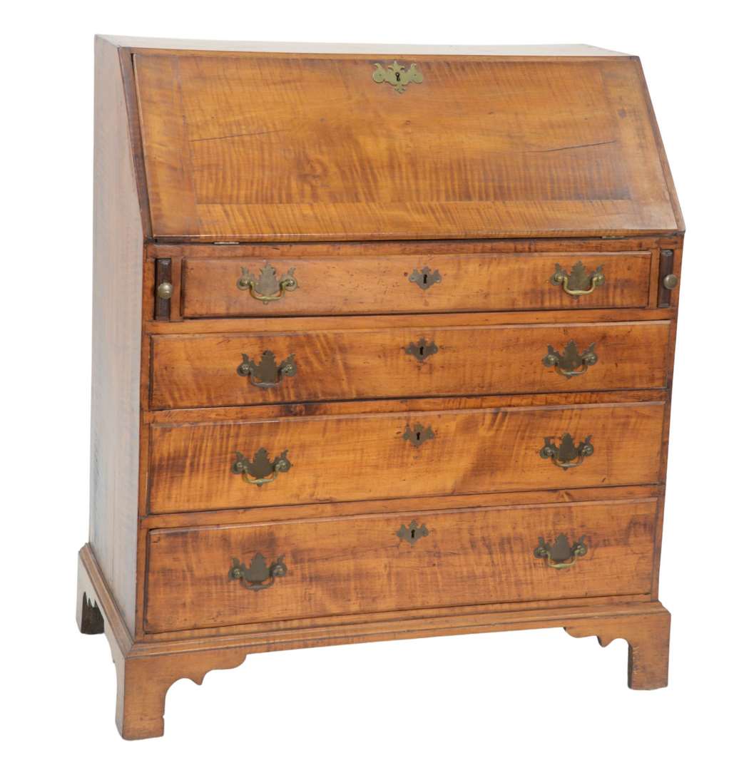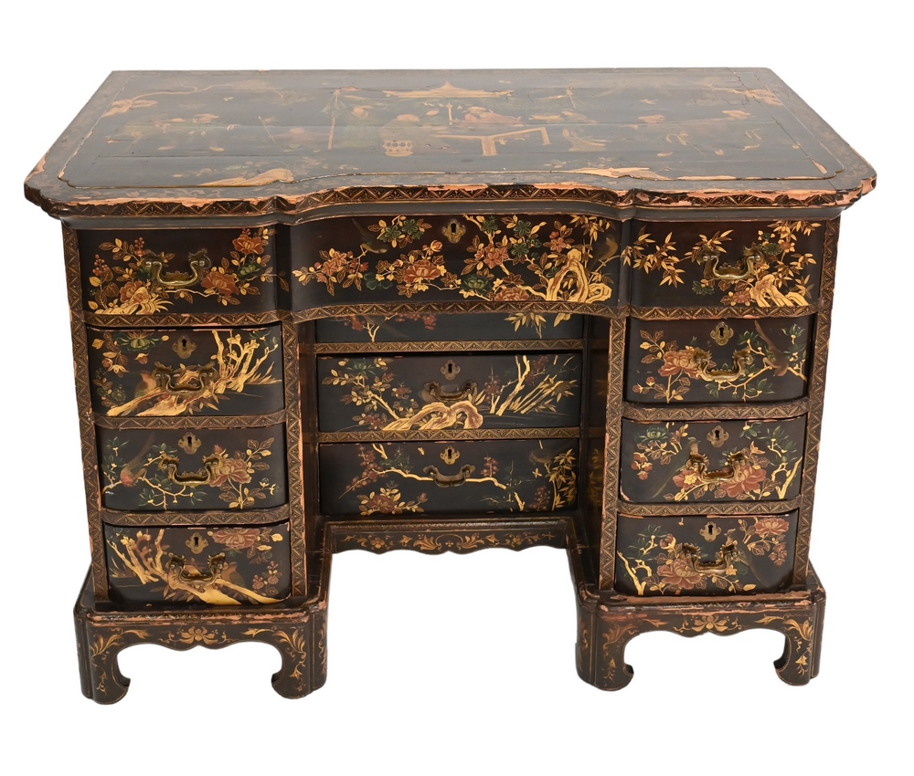 Chinoiserie Decorated Kneehole Desk, having blocked front top and front, top with genre scene of Chinese meeting with head of family, workers, and horseman, ends similar, probably 19th century, height 33 inches, top 25 x 47 inches, (some paint chips).
