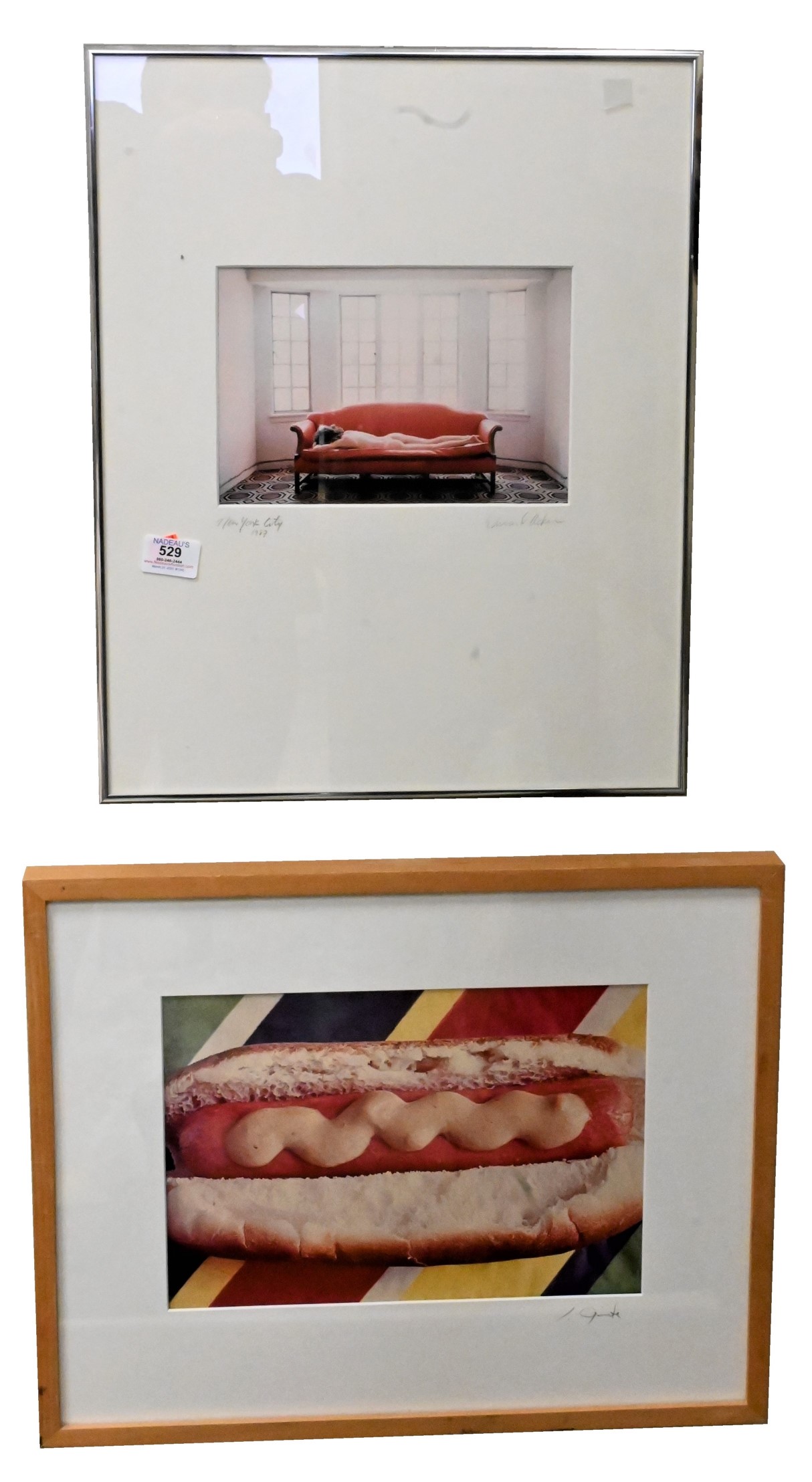 Six Piece Framed Art Lot, to include Linda Butler (American, b. 1947), “Looking at the Window”, silver print/photograph, signed and numbered 13/75 lower right; Edward Acker photography “New York City, 1987″, signed and dated in matting; a photograph of a hotdog, signed illegibly in matting, largest 18″ x 14 1/4″; along with three Linda Butler photography, additional unframed, on signed bottom right, 14 1/2″ x 18 1/4”.