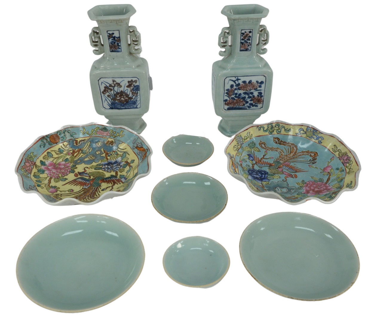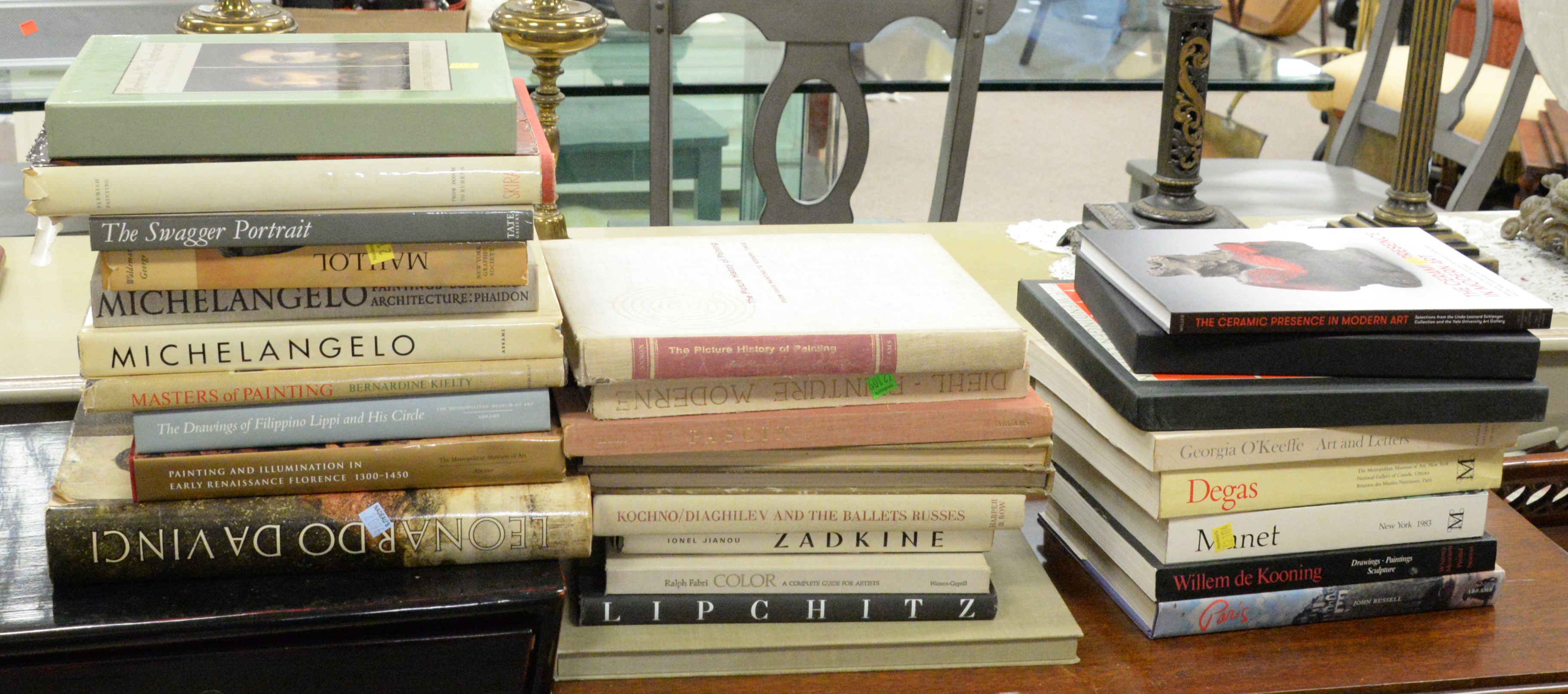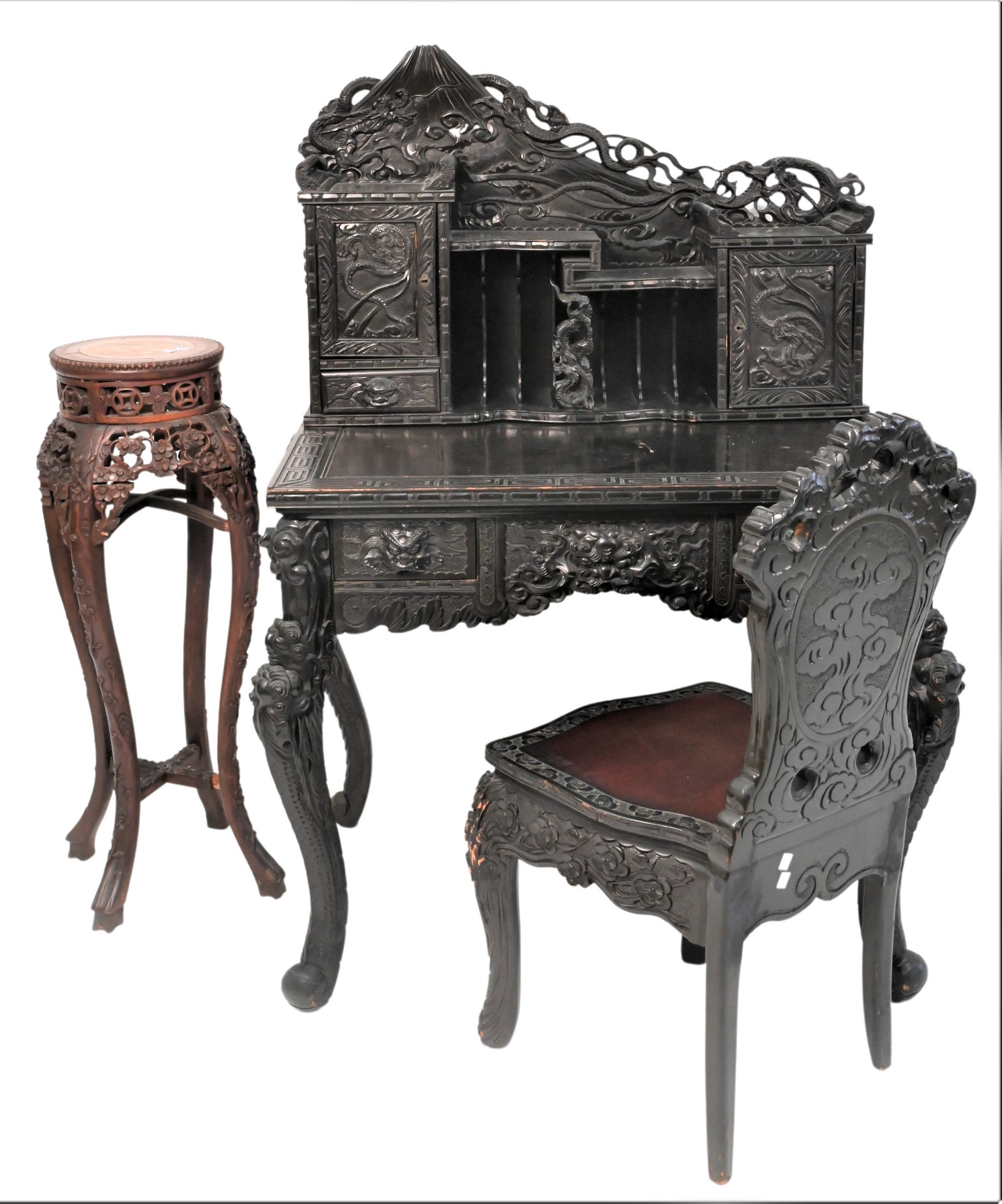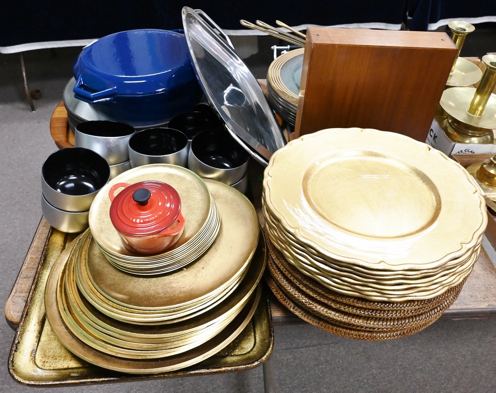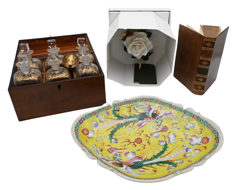 Table Group, to include crystal Sevres stems, Val St. Lambert coasters, Chinese porcelain plates, Chinese porcelain vase, decanter set in box, leather books, four Boehm flowers in boxes, large tapestry, mug marked with crossed swords, doll house furniture, etc.