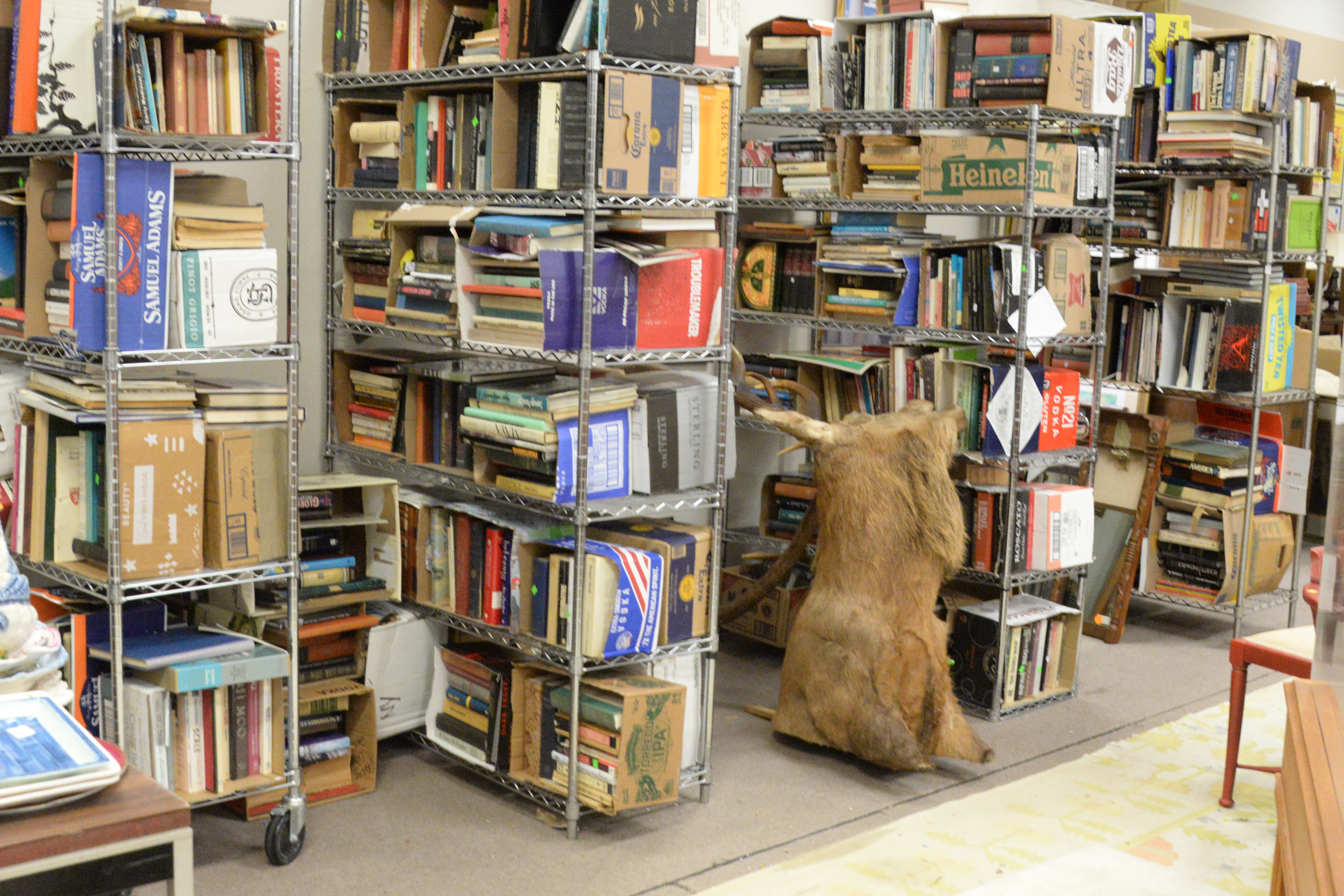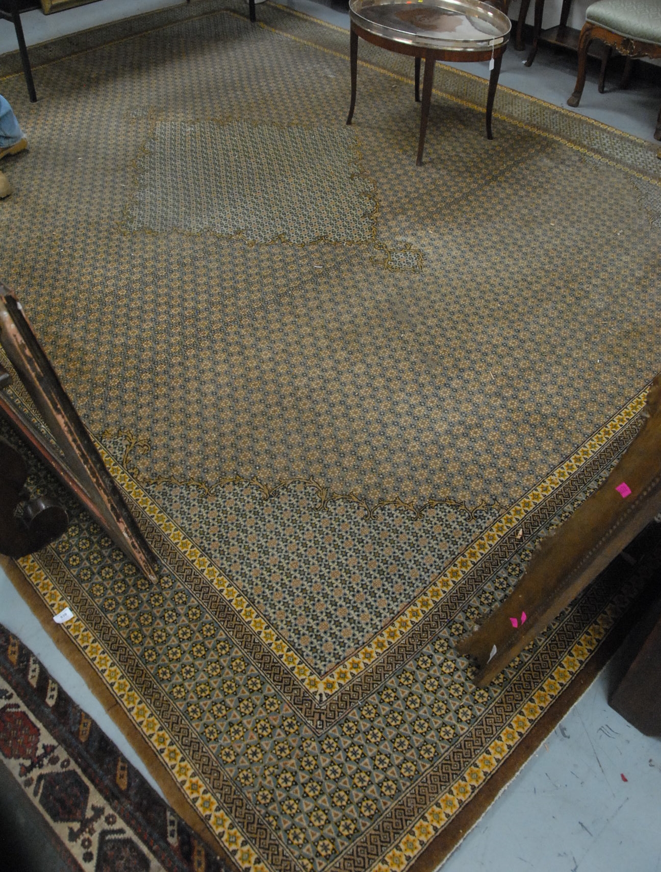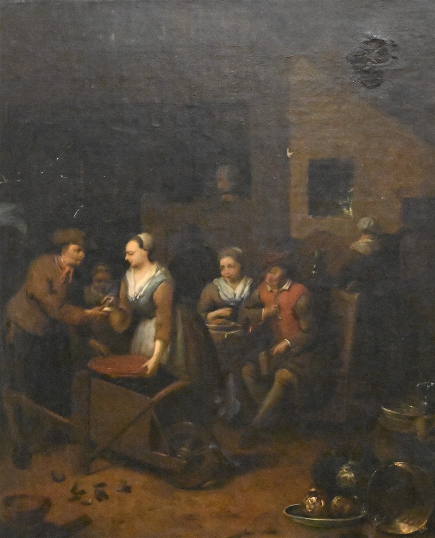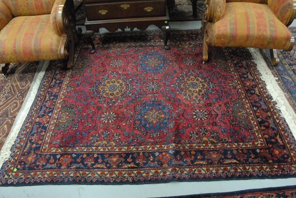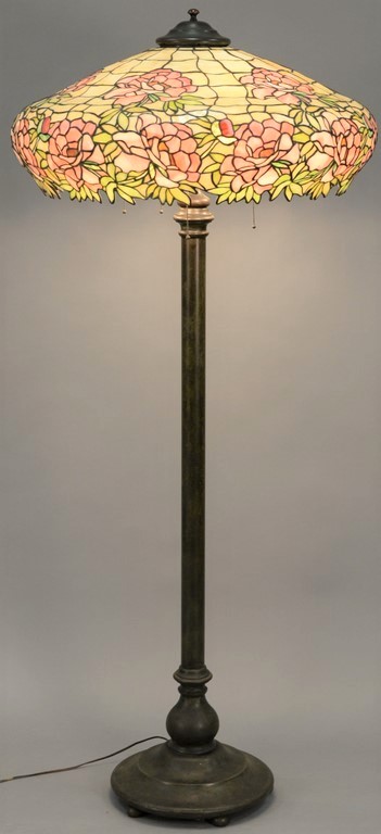 Unique art leaded glass floor lamp having large peony shade with pink, red, greens, and white glass on cast bronze footed base with cylindrical stem connecting to five socket cluster with goose neck arms, complete with cast bronze cap. keywords: Tiffany Handel, Duffner Kimberly, Gorham, Suesse Williamson ht. 72in., shade dia. 30in., shade ht. 14in.