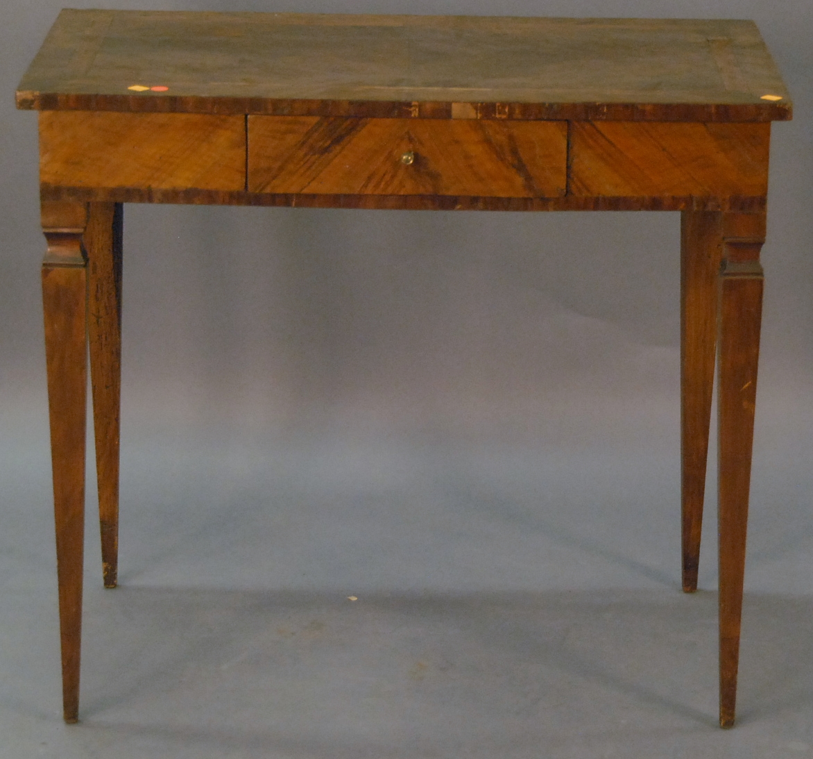 having three burlwood drawers with line inlay all raised on square tapered legs