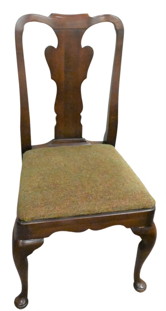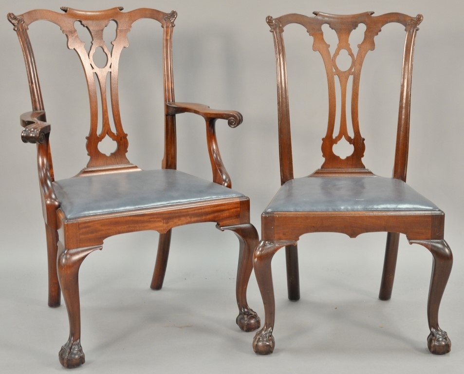 Margolis set of six Chippendale style mahogany chairs with open work back and blue leather slip seats, all set on cabriole legs ending in ball and claw feet, signed with hand written paper labels Nathan Margolis.