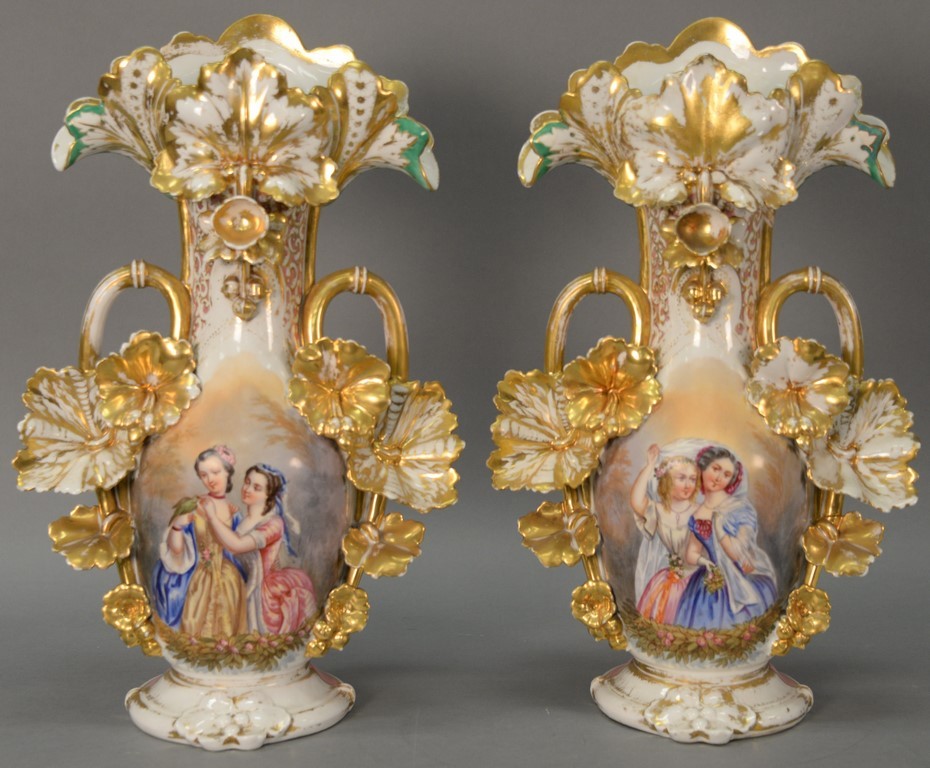 Cast Iron Mantle Clock, having painted flowers, landscape scene with mother of pearl inlay, height 19 3/4 inches. Provenance: Estate of Peter Tillou, Litchfield, Connecticut.