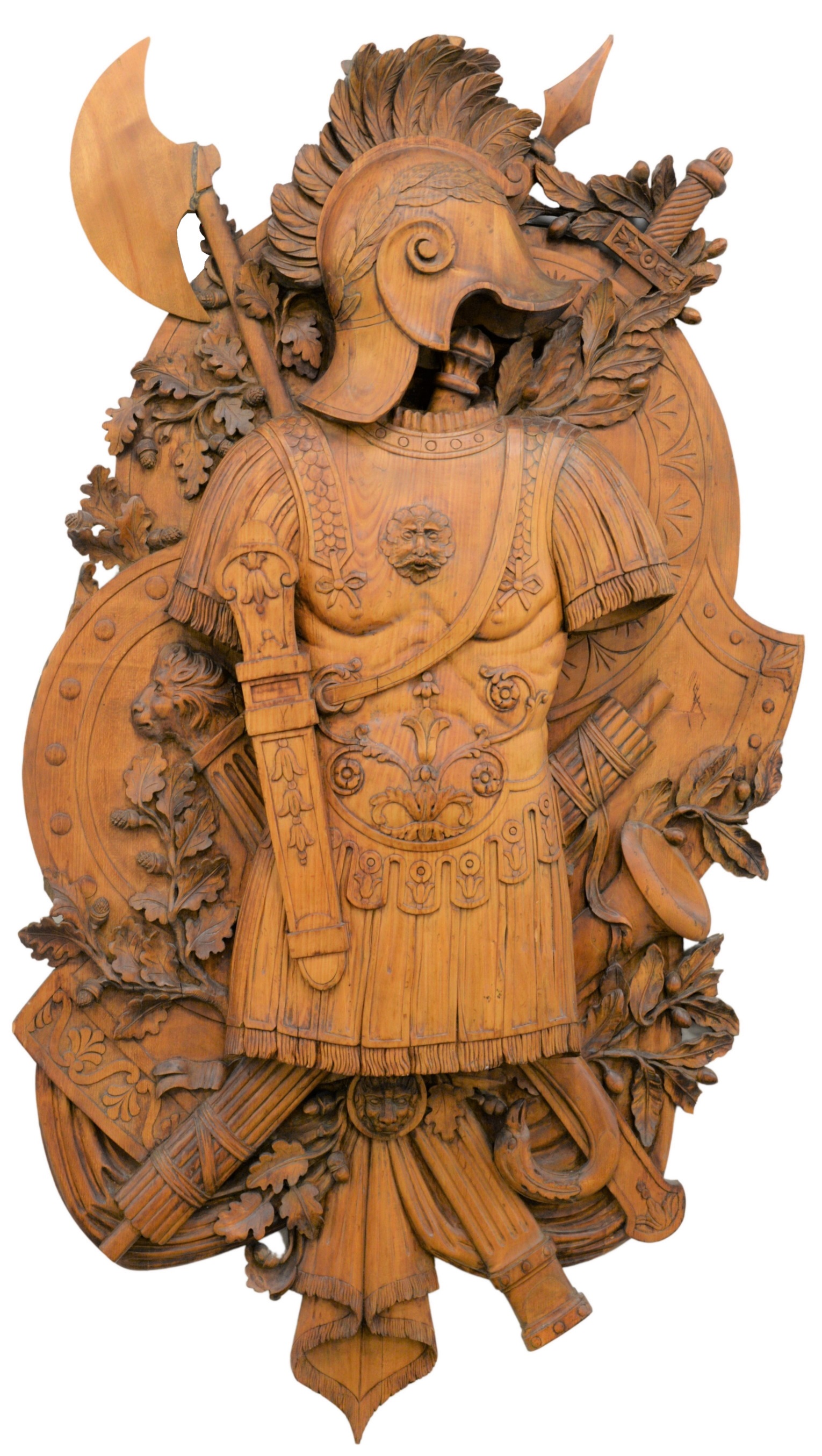 Large French Carved Pine Military Trophy, late 19th/early 20th century, carved suited soldier with shield, sword andox, on larger back plaque with carved oak leaves, acorns and lions, height 60 inches.