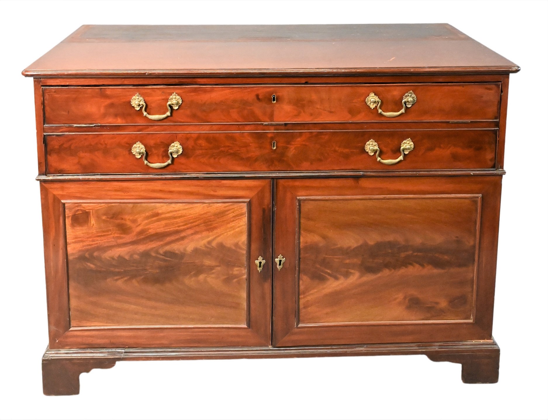 Chippendale Mahogany Desk, having slant lid over serpentine front of four drawers, set on ball and claw feet, interior with drawers, carved fan, along with two carved circular fans, Massachusetts, circa 1760, height 44 inches, width 42 inches.