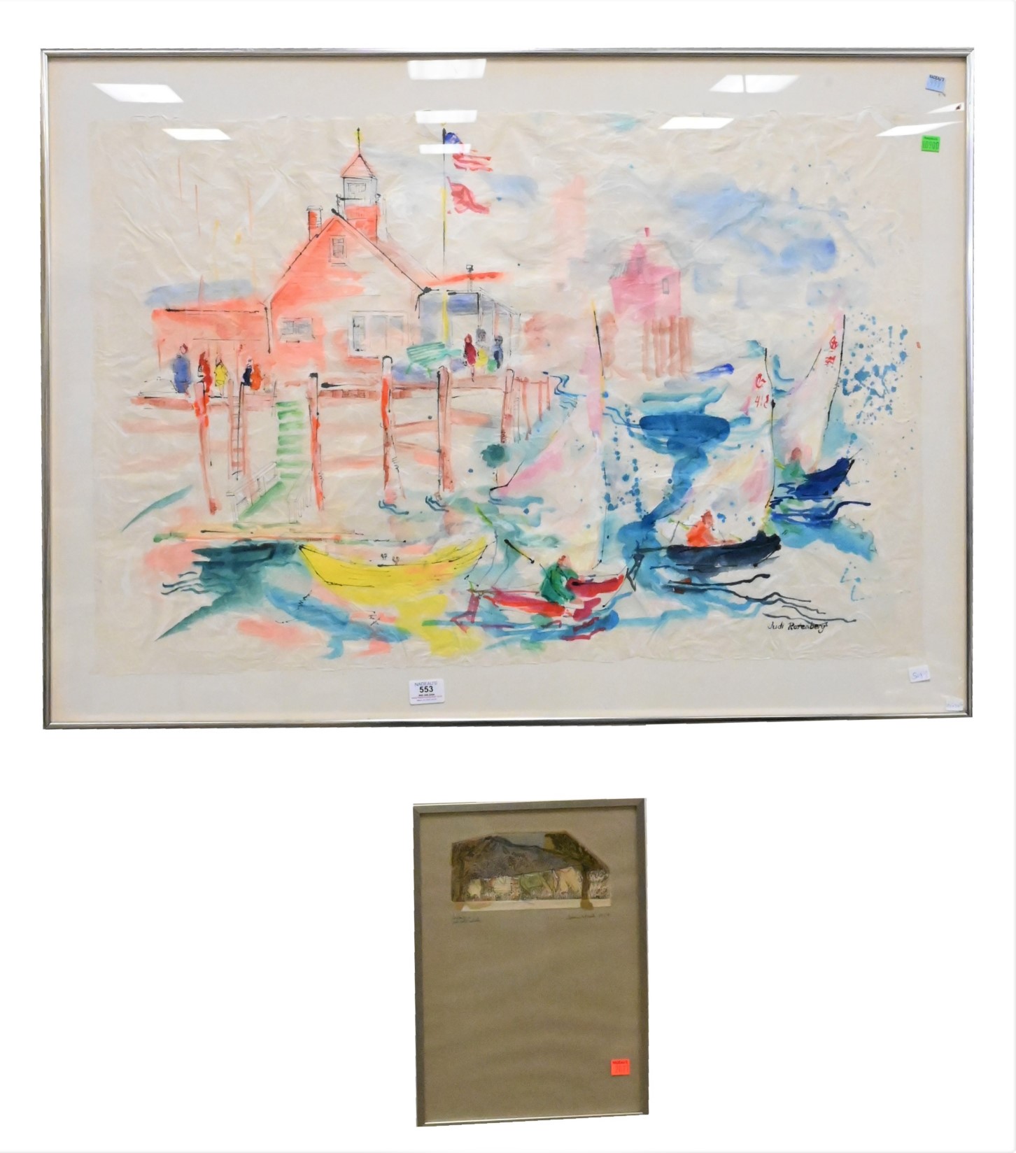 Seven Piece Abstract Artwork Lot, to include a watercolor on paper titled “Harbor”, signed Judi Rotenberg, 20th century, 24″ x 36″; a watercolor on paper attributed to William Seite, 1948, from Willard Gallery, 12″ x 19″; a collage on paper of a woman 19″ x 16″; a colored lithograph titled “Emerging Animal”, signed “Pat Abbott 81/81″, 13″ x 16”; a watercolor and gouache on paper of several figures in an ocean seascape, initialed “L.M.” lower left, 5 1/2″ x 5 1/2″; a watercolor etching collage signed illegibly lower right “1974”, 13″ x 19 1/2″; along with an acrylic on paper, still life of flowers, initialed “AK 86″ lower right, 8 1/2″ x 11 1/2”.