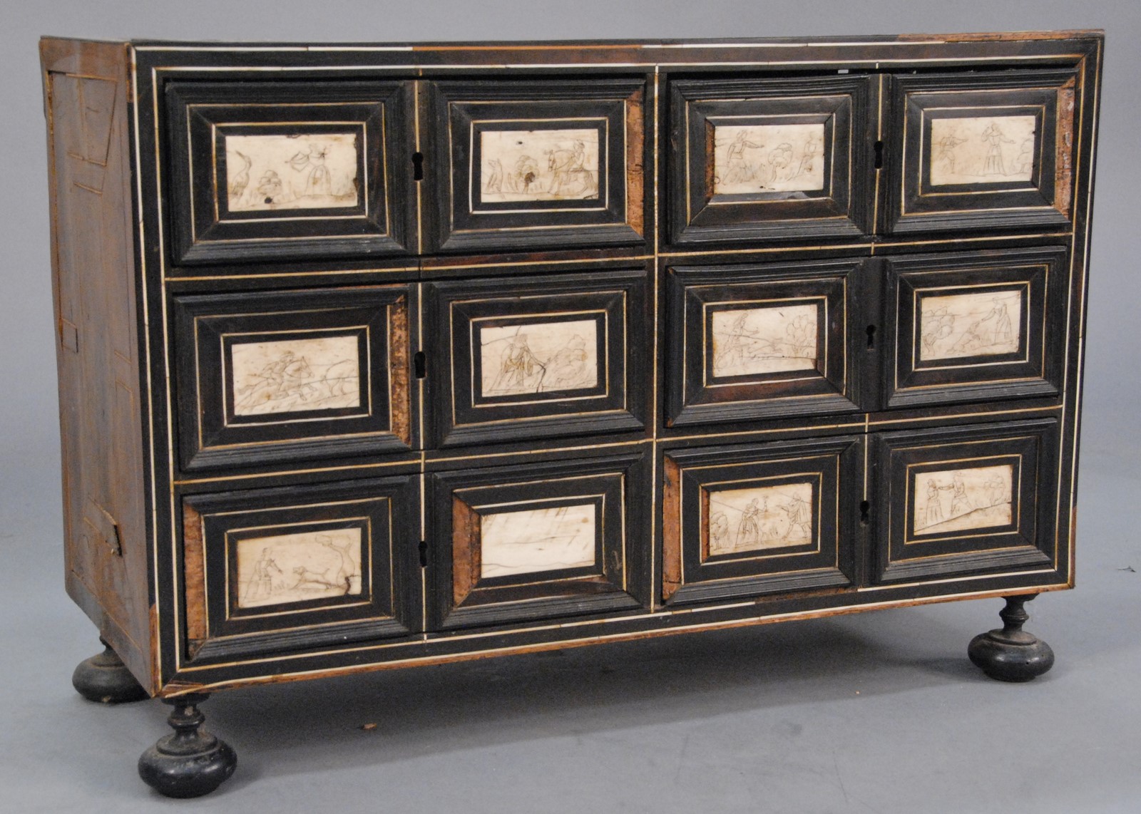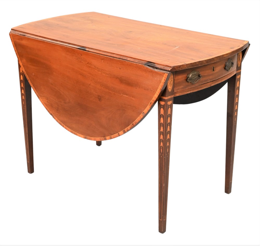 George III Mahogany Pembroke Table, having oval drop leaf with bowed drawer, on square, tapered legs, inlaid with oval panels and bell flowers, circa 1800, hard pine group, hard pine group, stationary rails, and drawer linings, height 27 inches, top 48″ × 38″, Mabel Brady Garvan Collection. Provenance: Jacob Margolis (born Russia, probably 1875), New York; consigned to American Art Association, Inc., New York, November 5–6, 1926, lot 233; sold to Francis P. Garvan (1875–1937), New York; gift to Yale University Art Gallery, New Haven, Conn., 1930.