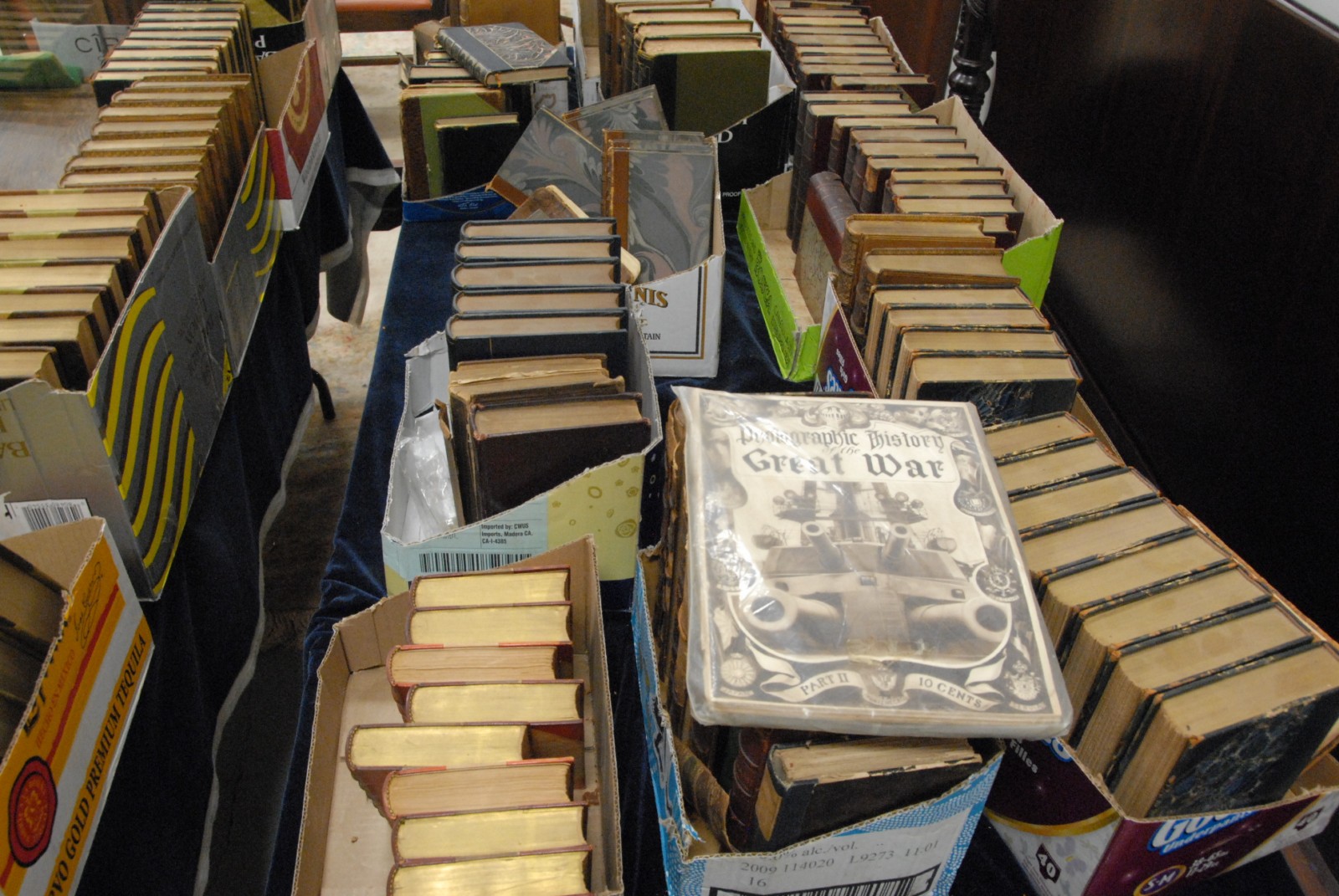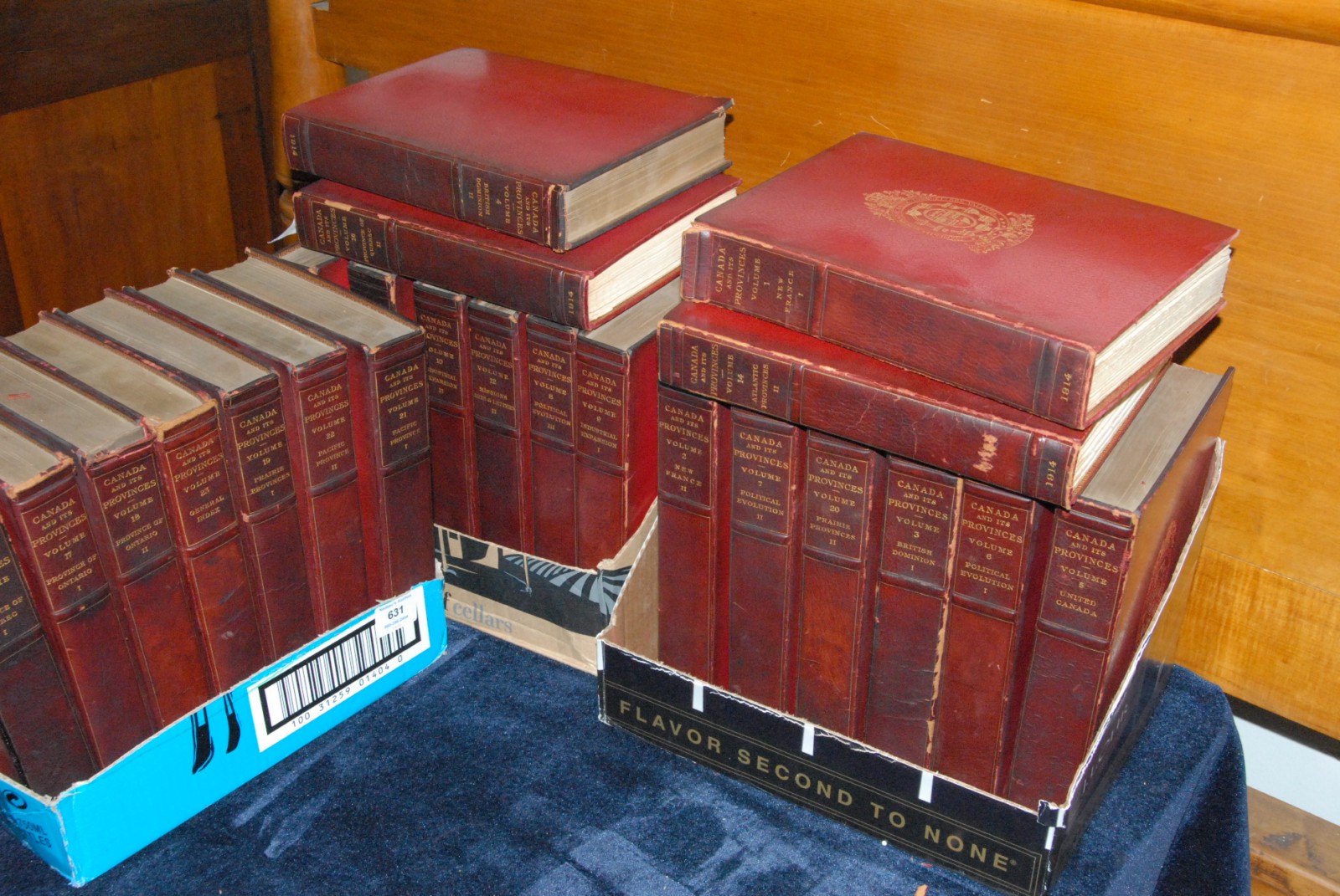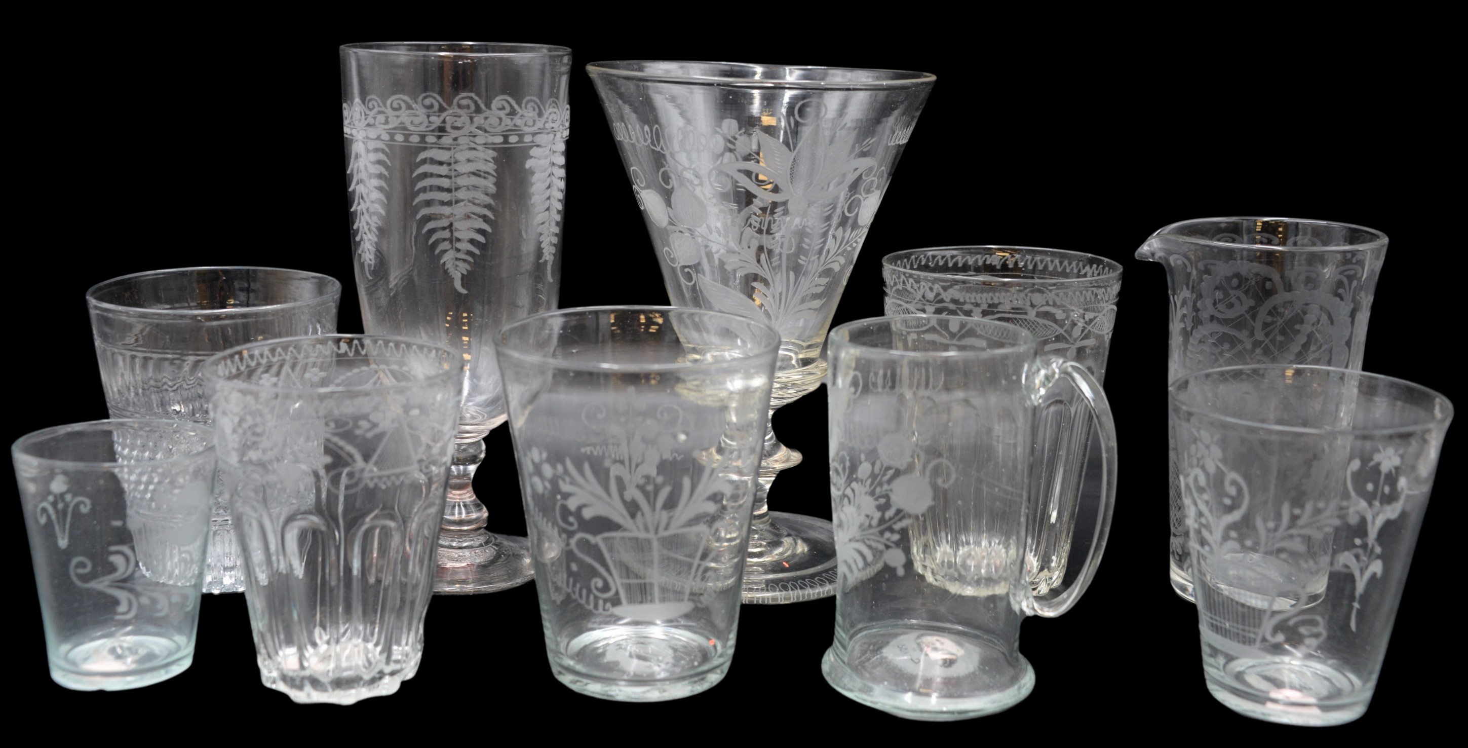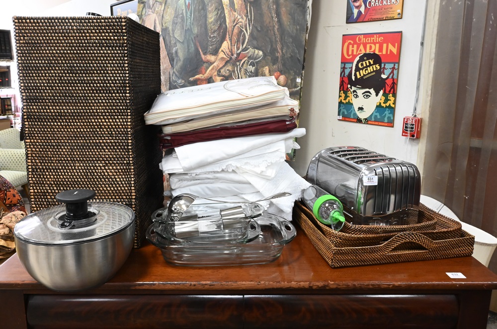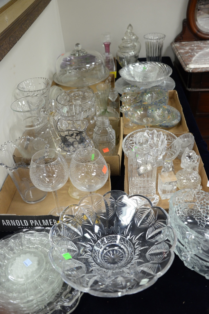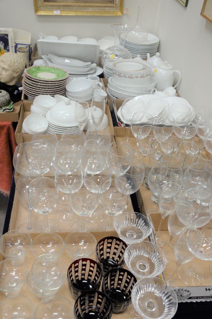 Four Box Lot of Large Glass and Dinner Ware, to include six piece group of Waterford crystal “Colleen” nut dishes, having “Waterford” etched marking on underside, height 2 1/2 inches, diameter 3 3/4 inches, a pair of crystal teardrop candlesticks, having “Steuben” signature etched on underside, height 10 inches, four glass sterns height 4 1/2 inches, 12 crescent England dinnerware, having porcelain octogonal shape and gilt borders to include six soup bowls (diameter 9 inches), and six dinner plates (diameter 10 inches); Strombergshyttan Modern Swedish crystal clear blue bowl, signed on underside and marked 7389, height 5 inches, diameter 8 1/2 inches; group of 14 Choisy Le Roi Majolica plates with botonical designs, marked on underside, along with trumpet vase with serling rim, three vanity bottles and two Japanese shot glasses, diameter 7 1/2 inches