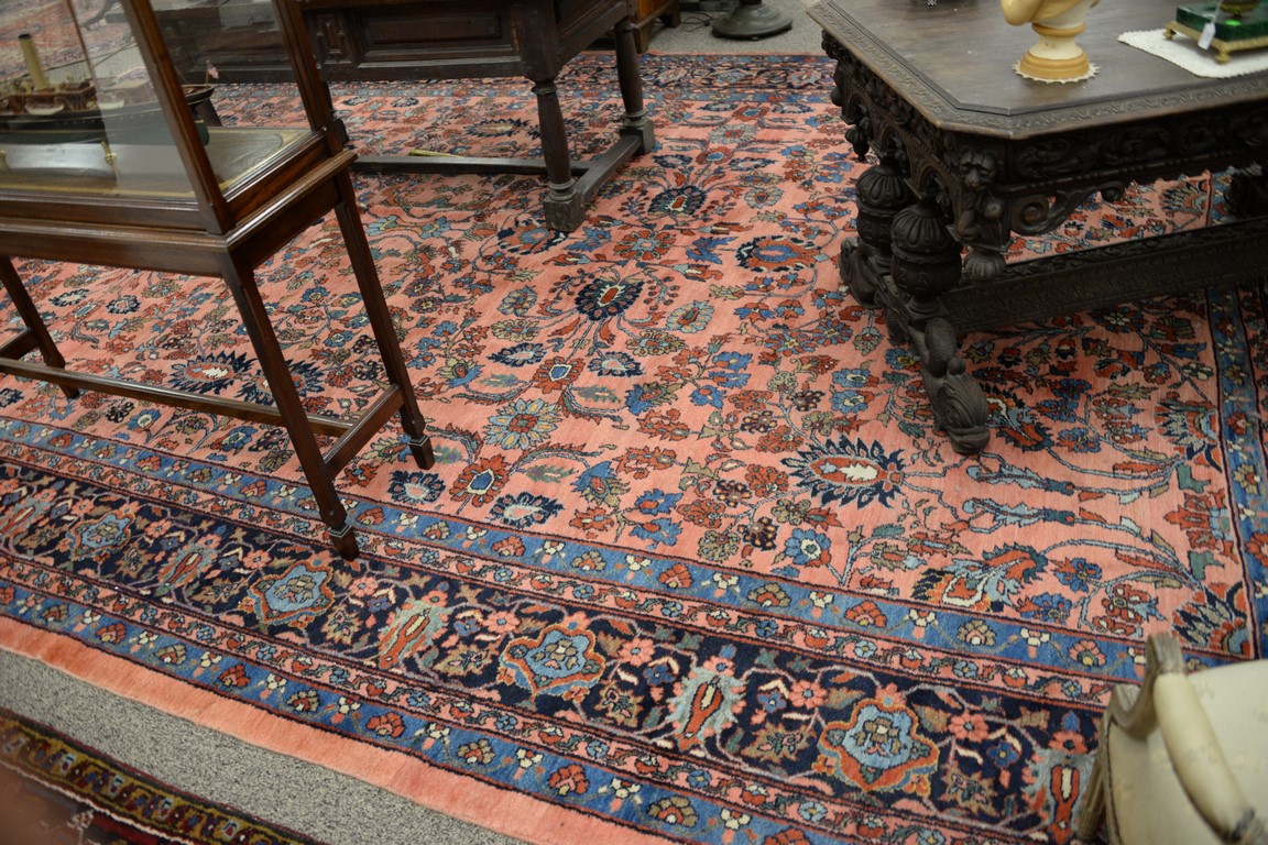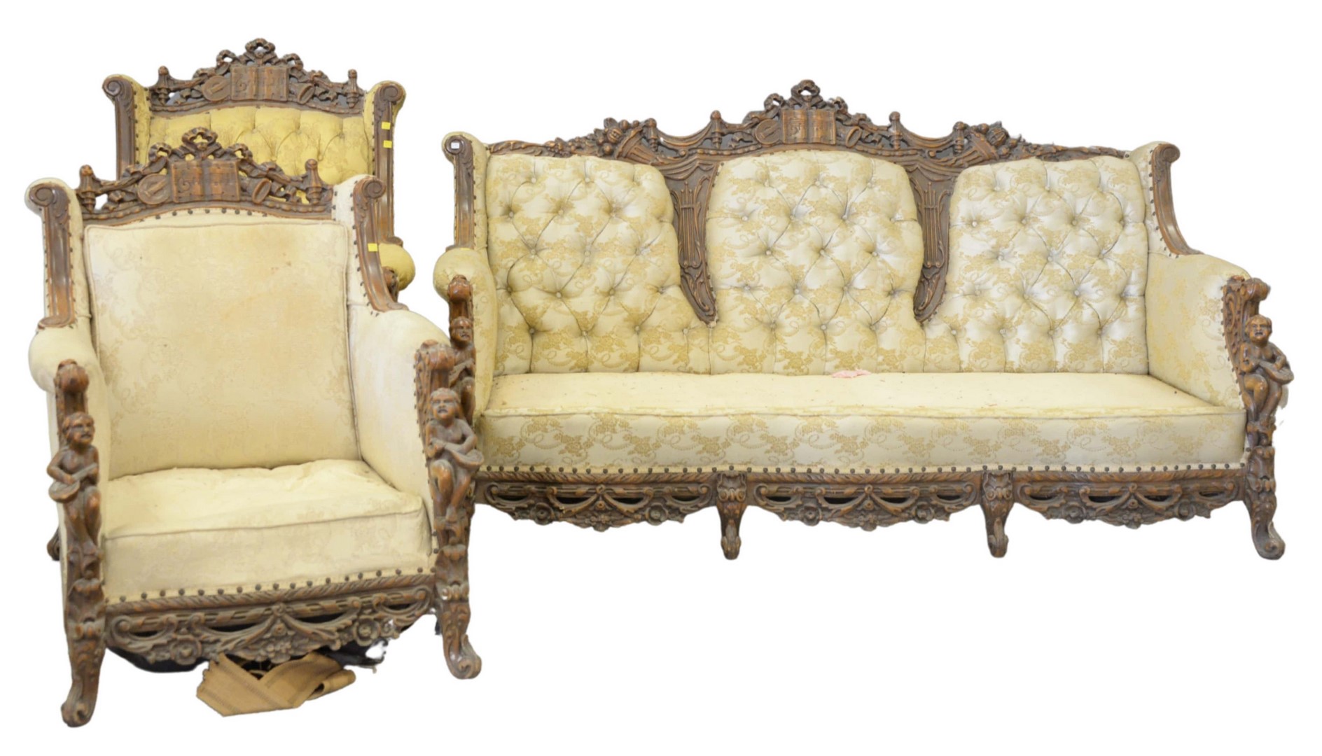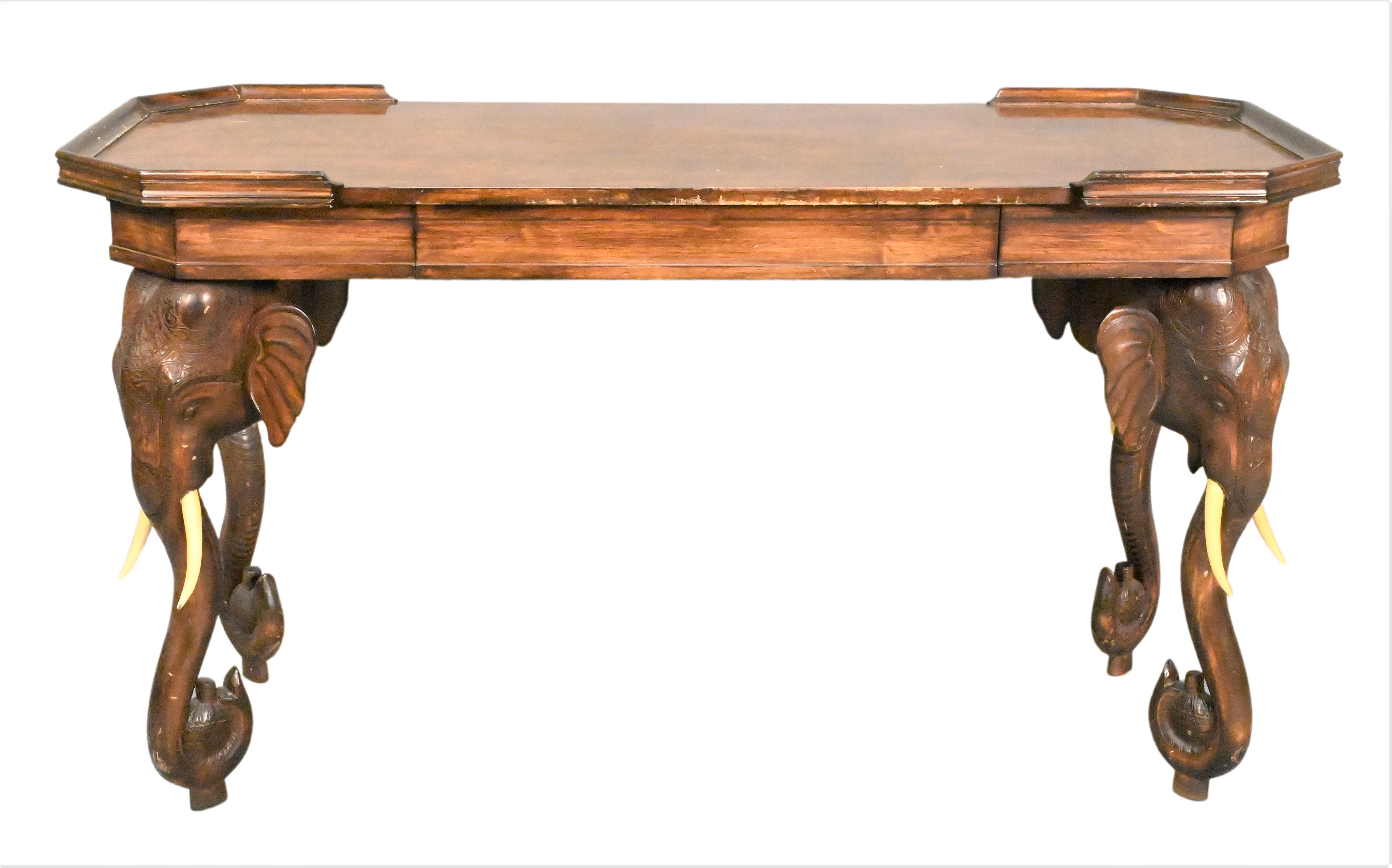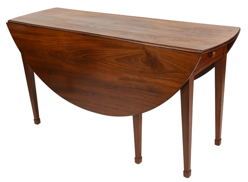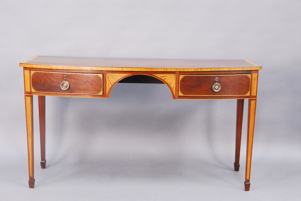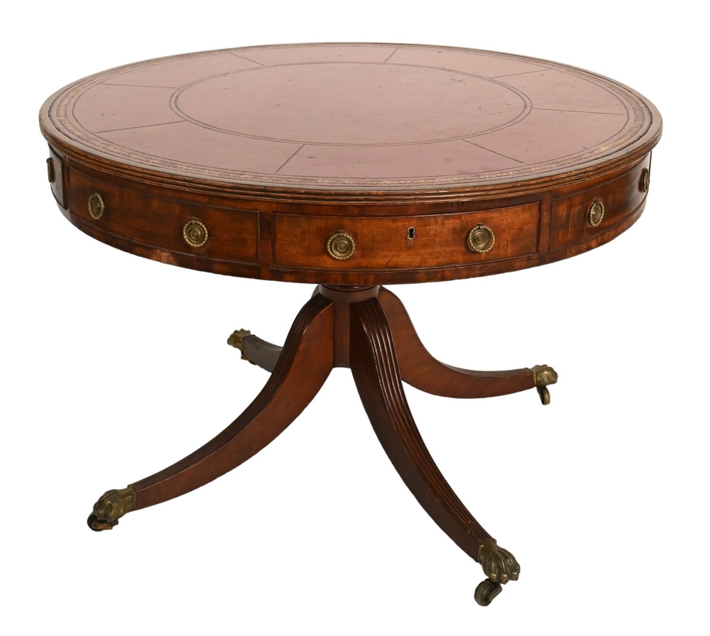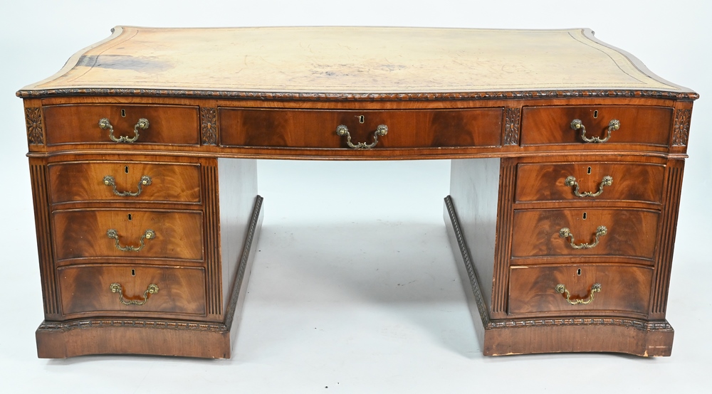 George IV Mahogany Pedestal Partners Desk, in the manner of Gillows Lancaster and London, having serpentine form inset leather writing surface, carved edge over conforming serpentine front, back, and ends, front with drawers, back with drawers and doors, stamped W. Wilson, London, height 30 inches, top 41″ x 67″. Provenance: Kentshire Galleries, Ltd., 37 E. 12th Street, New York, 1992, paid $53,500. From a private New York City collection.