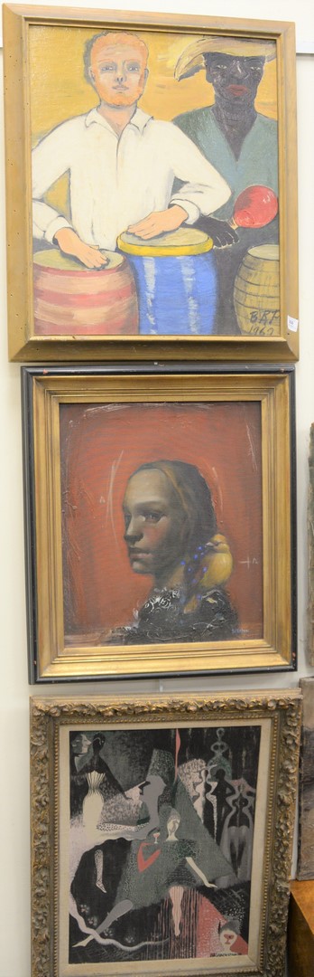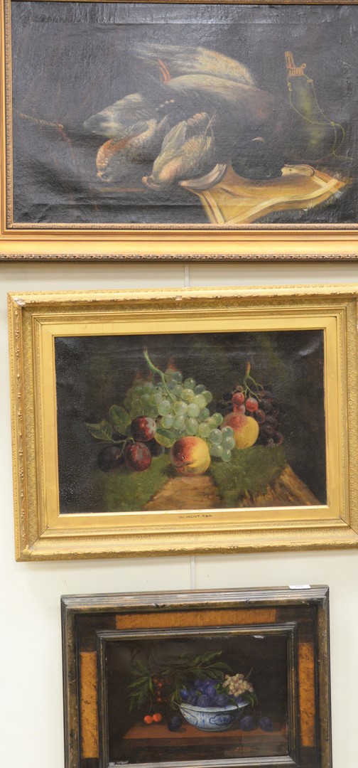 Three Piece Lot, of Still Lives to include a large scene, After the Hunt, having a duck and two other small game birds, oil on canvas, unsigned F. Valleroio, still life with blue and white porcelain, oil on canvas along with a W. Hunt still life with grapes, oil on canvas, largest 16 1/2 x 26.