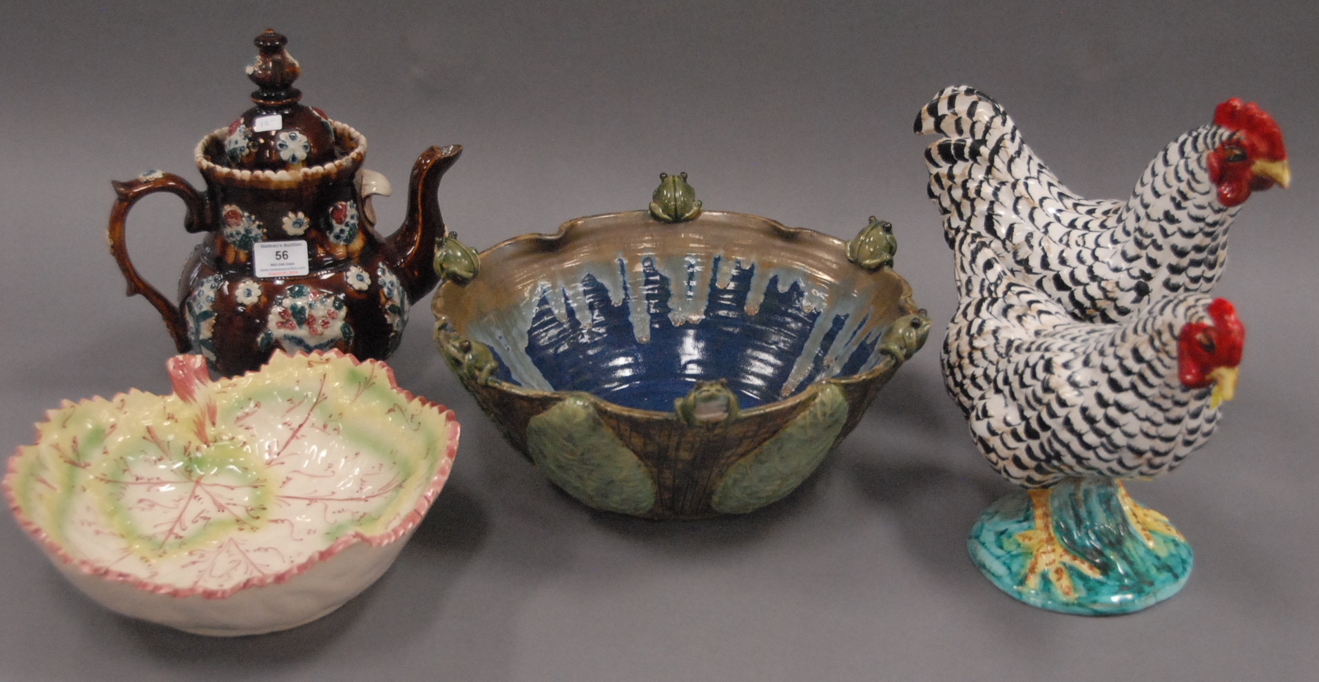 Lot 56: Five glazed decorative pieces to include a brown glazed pitcher, large frog bowl, two roosters, and a leaf bowl.
