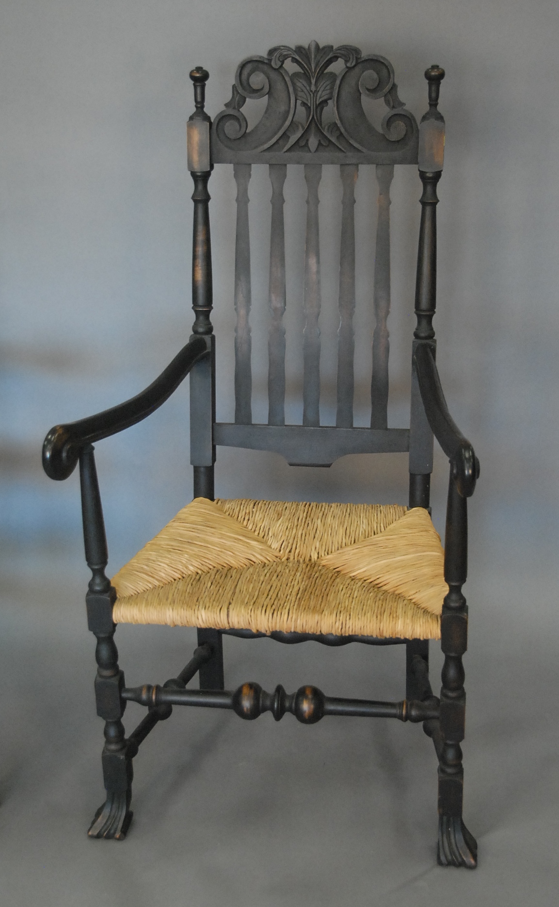 Lot 56: A. D. Allen Windsor bow back side chair with bold turned stretchers, signed on bottom A. D. Allen. seat ht. 18 in. Provenance: Property from the Estate of Elizabeth and Edward Wallace of The Tracy House in Meriden, Connecticut.