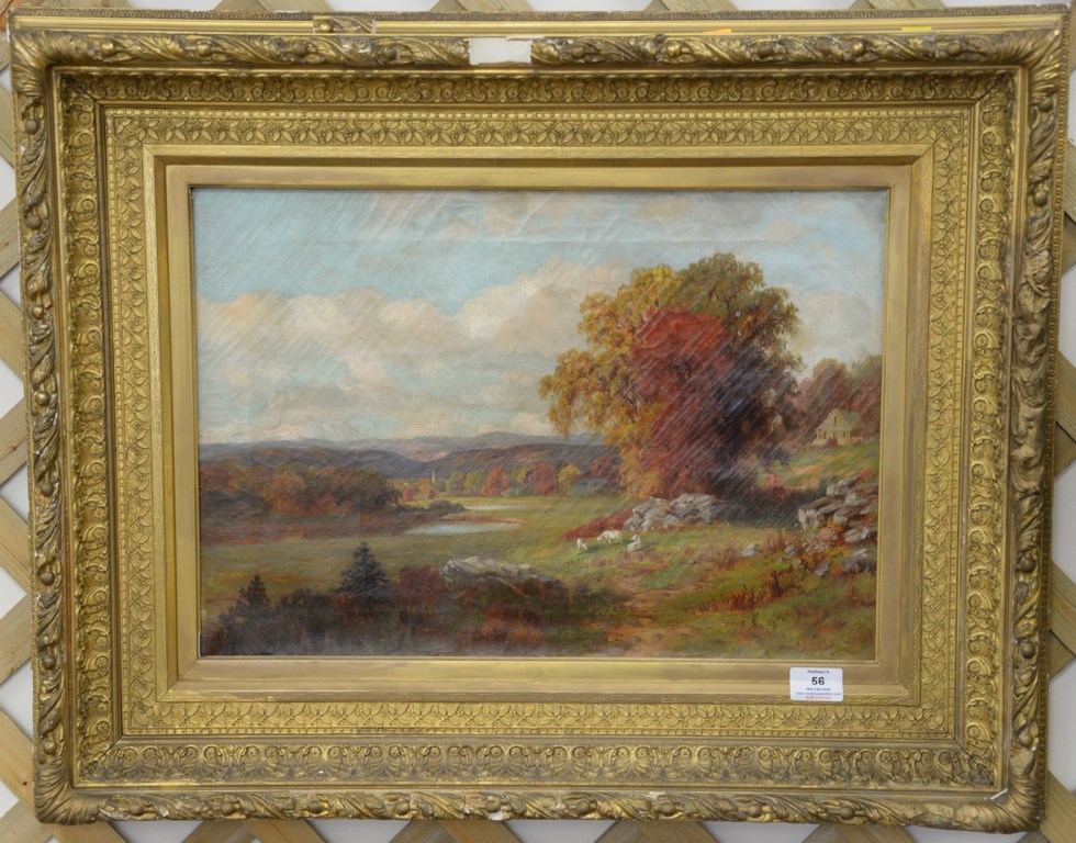 Lot 56: Fall landscape oil on canvas in gilt frame, 19th century, 14 x 20.