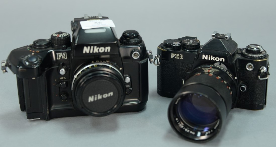 Nikon camera lot including Nikon F4 missing battery door 2173394 with 50/1.8 series E 2904015 and Nikon FE2 2552730 with Vivitar 135/2.8 28120116.