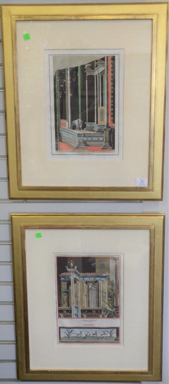 Set of four hand colored Italian engravings after Giambattista Nolli, architectural design including Gio Morg quattro palmi Napoletani, Fran La Vega Portici, Scala Unius palm Gaultier, Nic Vanni Rom Reg delin, Scala unius pal Rome, Nolli, and France la Vega Spag, Gaultier Sculp plate size 13 1/2 x 9 3/4 Provenance: Property from the Credit Suisse Americana Collection