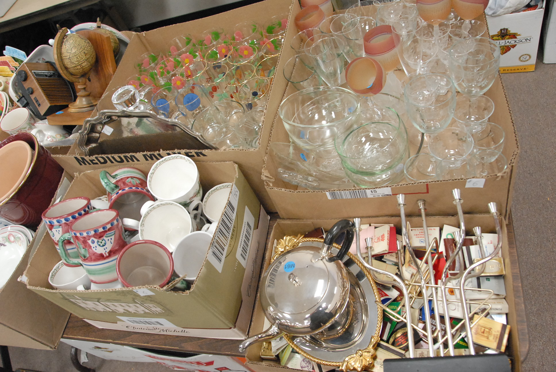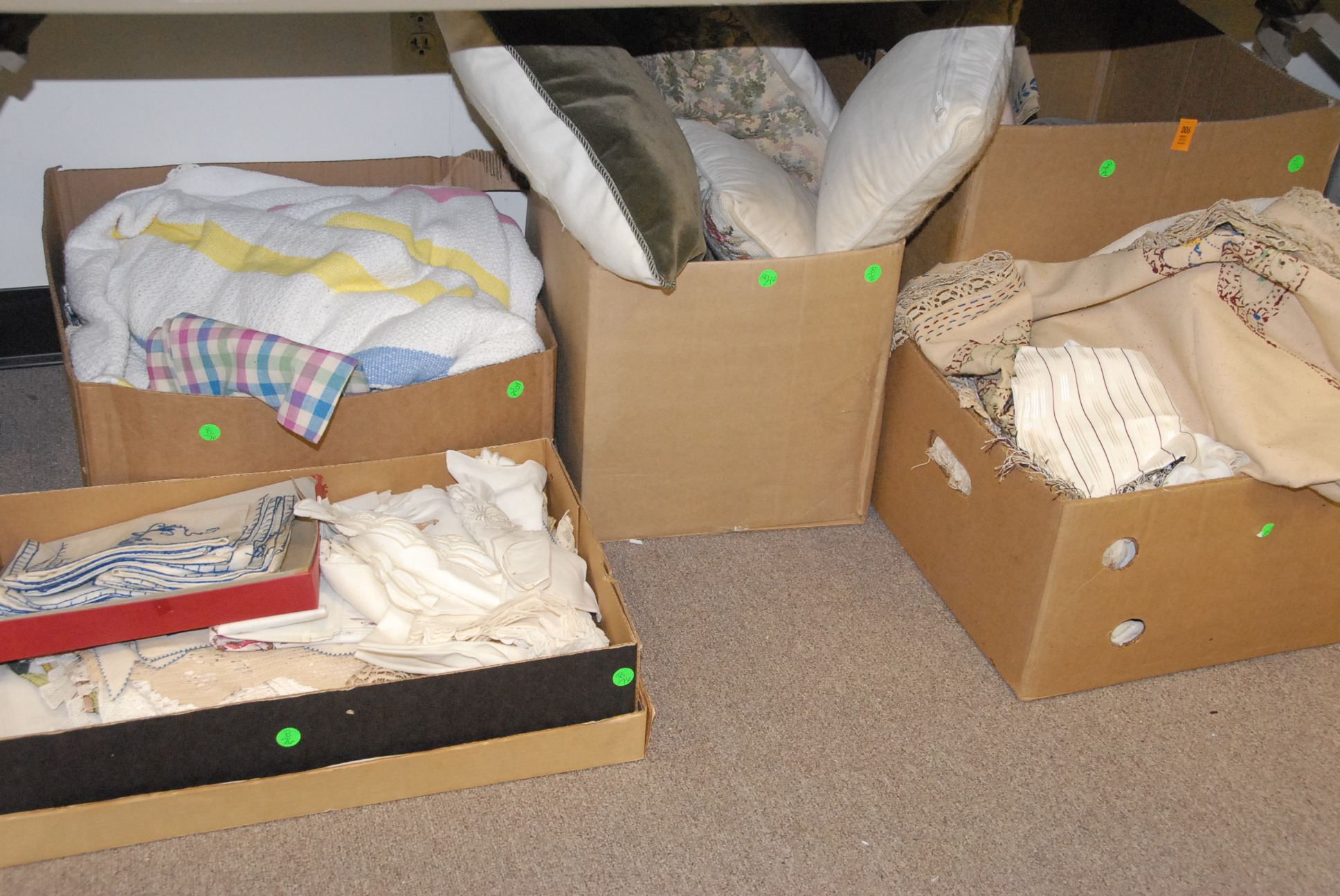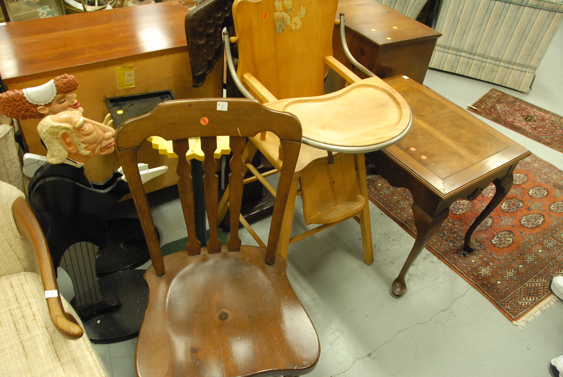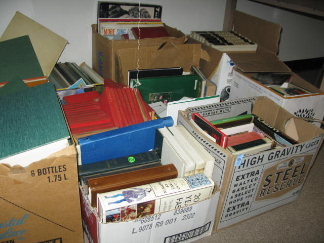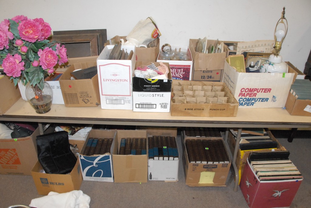 On top and under a table books, glassware, Victorian frames, lamps, records, and miscellaneous along with porcelain top table, office chair, side chair, metal flower, coats, file cabinet, antique pine lift top commode, large trunk, exercise machine, and cedar chest.
