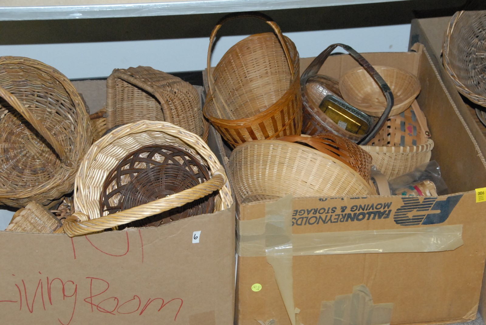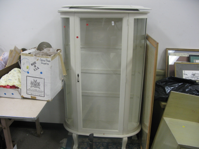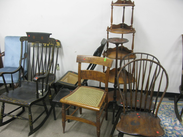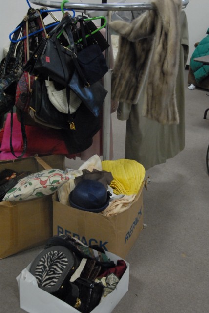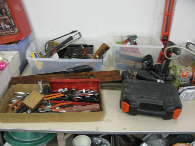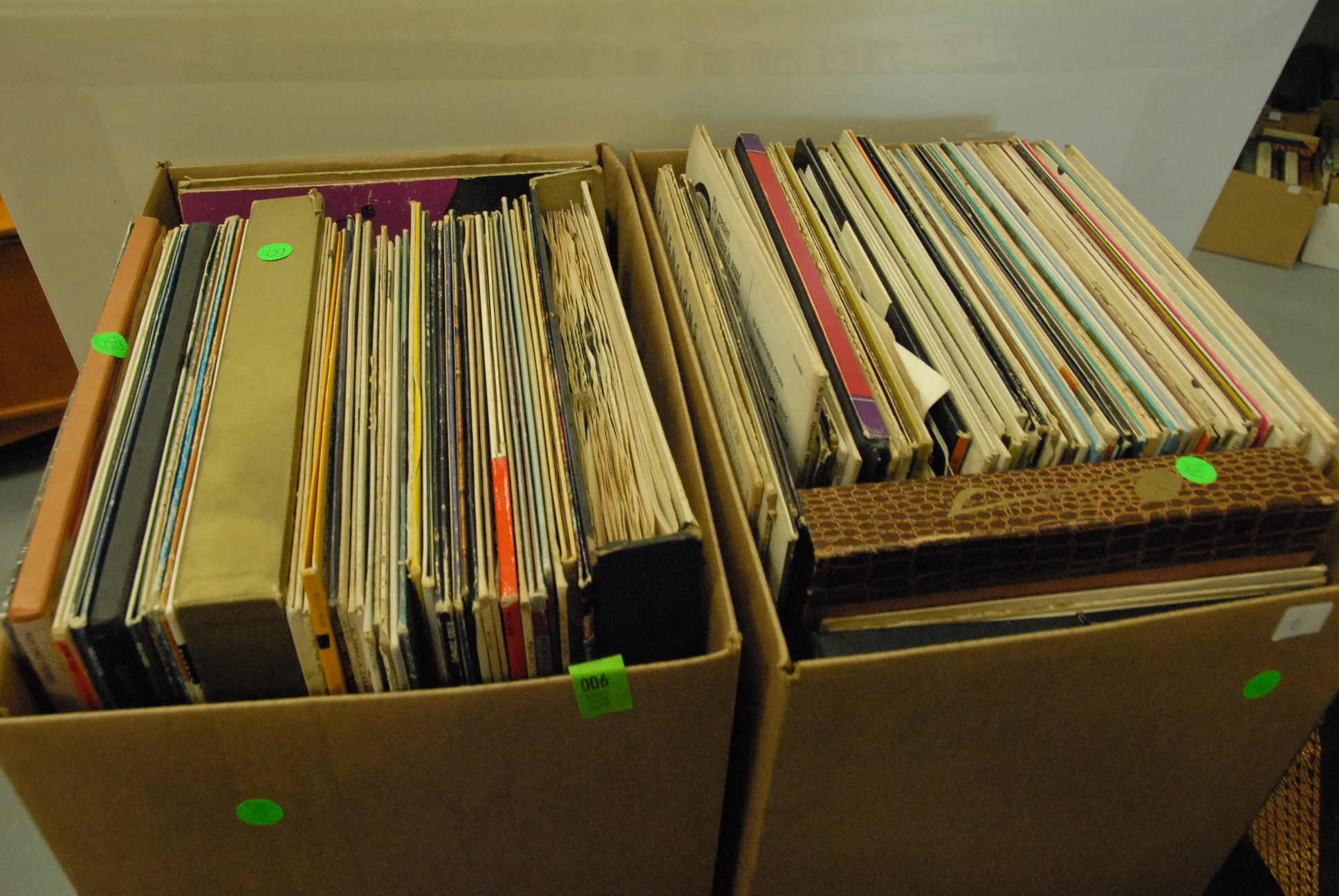 On top and under a table books, glassware, Victorian frames, lamps, records, and miscellaneous along with porcelain top table, office chair, side chair, metal flower, coats, file cabinet, antique pine lift top commode, large trunk, exercise machine, and cedar chest.