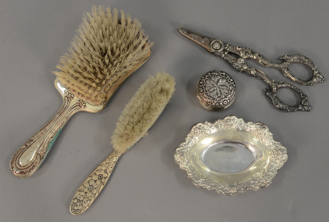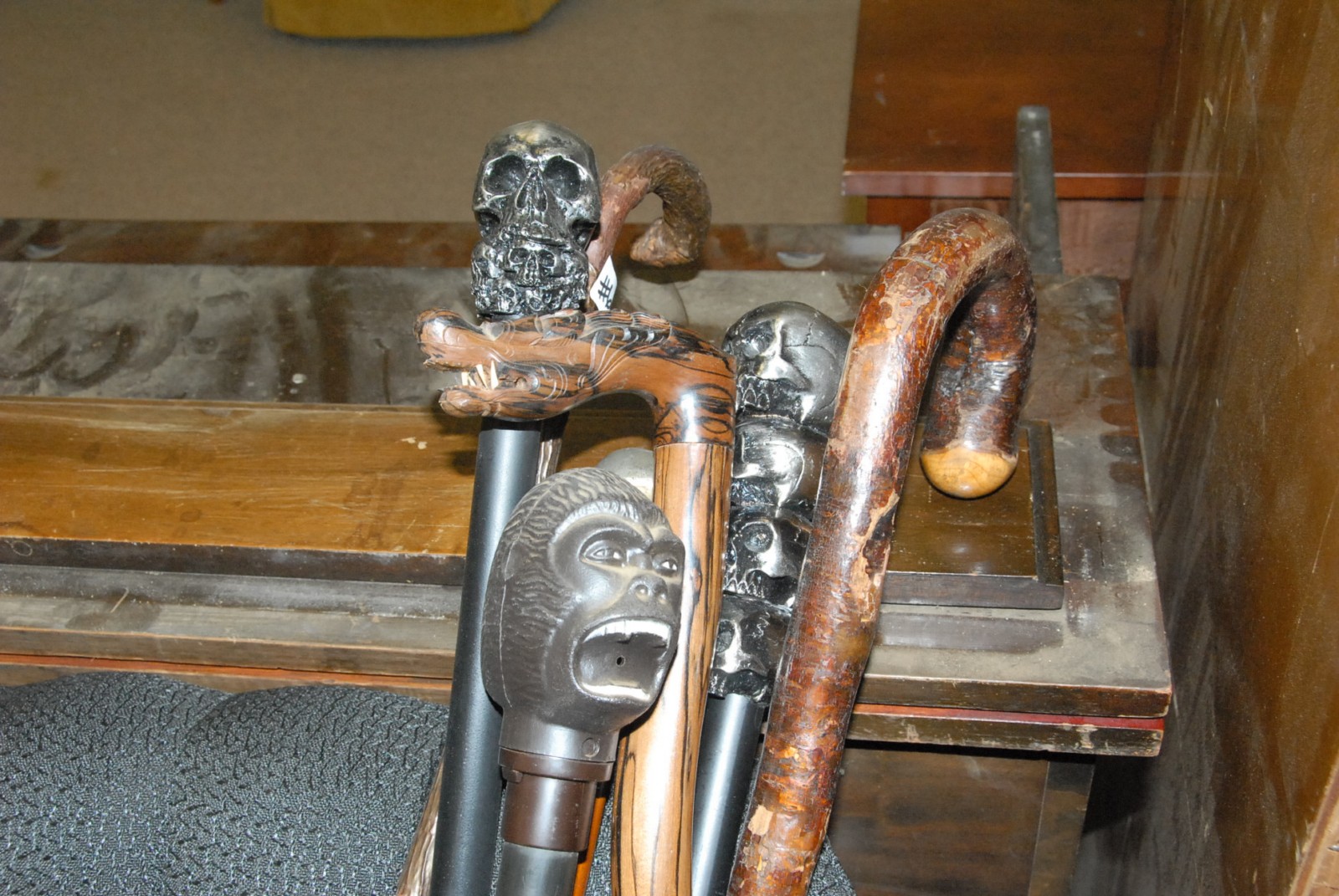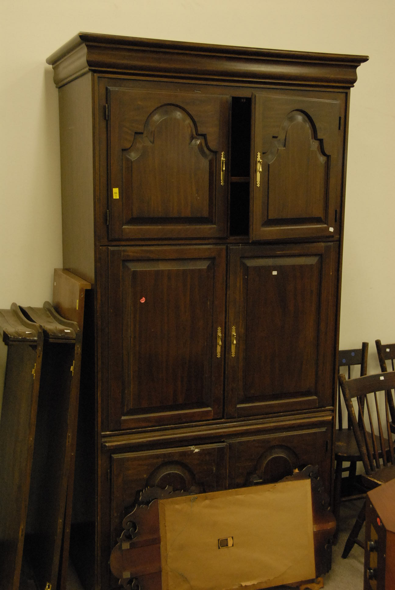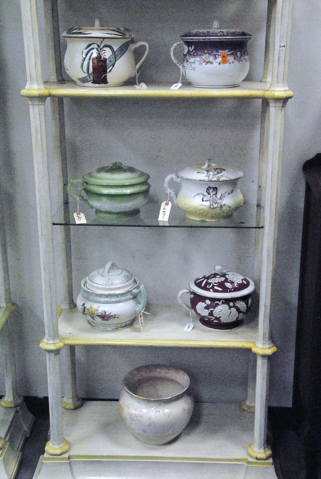 On top and under a table books, glassware, Victorian frames, lamps, records, and miscellaneous along with porcelain top table, office chair, side chair, metal flower, coats, file cabinet, antique pine lift top commode, large trunk, exercise machine, and cedar chest.