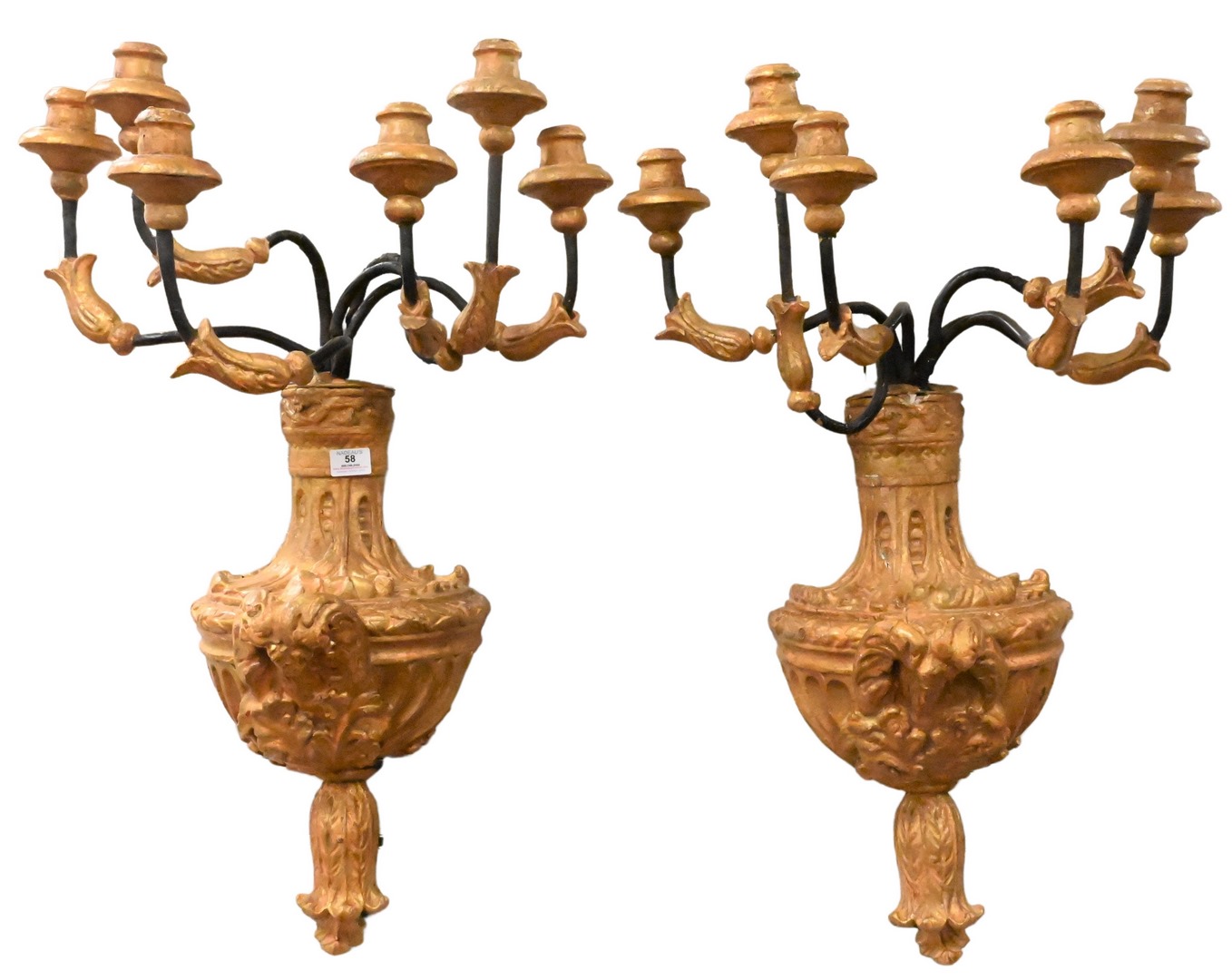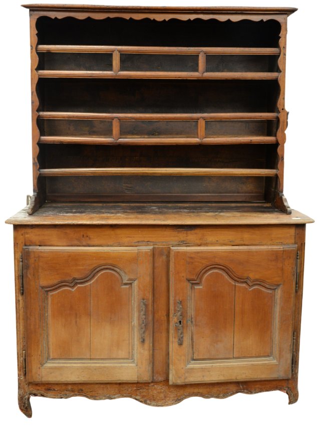 Louis XV Fruitwood Hutch, in two parts, upper section with open shelves, on cabinet base with two paneled doors, flanked by fluted corners, top staining and imperfections, split, early 18th century, height 84 inches, length 60 1/2 inches, depth 25 1/2 inches.