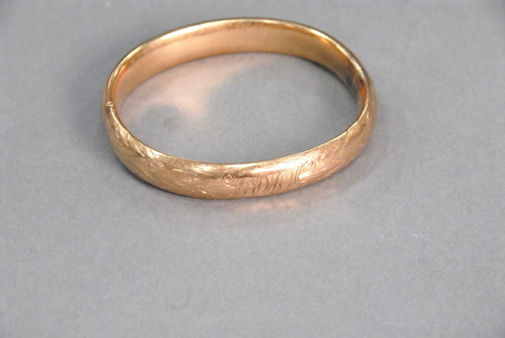 14 Karat Gold Band Bracelet, having incised scrolling leaf design, marked 585, length 7 1/2 inches, 41.1 grams.