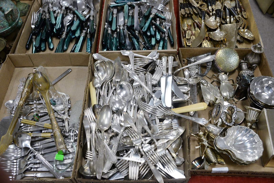 Six box lots to include Siam flatware set with wood handles, Thailand flatware, silverplated flatware, silverplated bee boxes, shell dishes, salt and peppers, stainless flatware, etc.