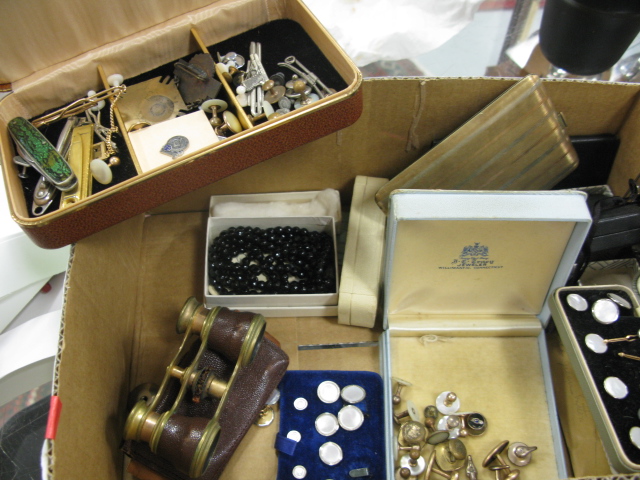 Box lot of cuff links, pins, medals, gold inlaid cigarette case, jack knife and misc.