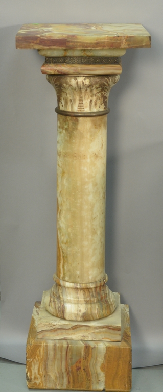Lot 103: Large Victorian onyx pedestal with swivle top and etched design with brass mounts. ht. 43in., top: 15 x 15