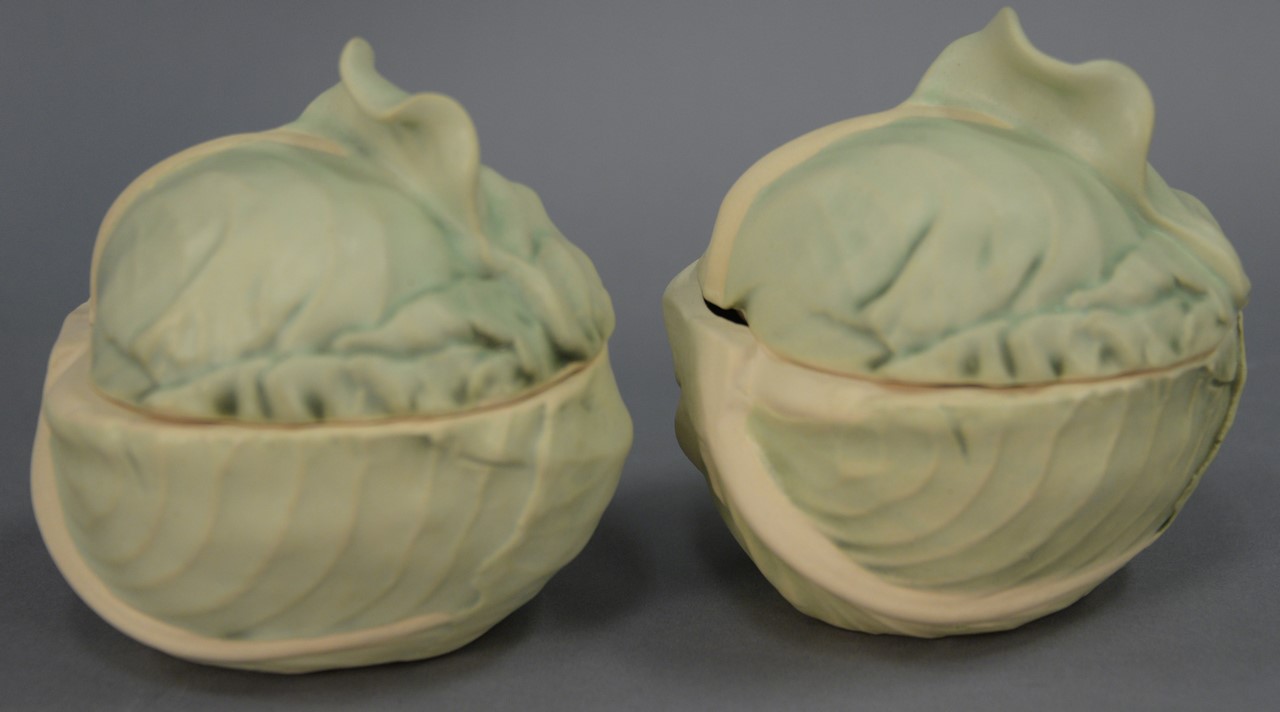 Set of 15 ceramic cabbage bowls with covers initialed on bottom. ht. 5in.