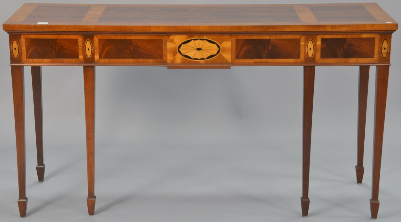 Lot 103: Hekman mahogany inlaid server with inlaid panel top and front. ht. 32in., top: 20 x 60